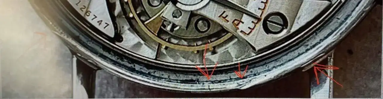 Esto es lo que se puede ver en la foto del movimiento, pero de arriba. La flecha que va del volante hacai abajo es un corte en la rosca, esto significa que no se puede cerrar bien la tapa, porque se abre mas. Aparte de esto falta material en la caja. Hablado con mi amigo el relojero de Rolex, tiene laser para substituir lo que falta y cerrar el corte.