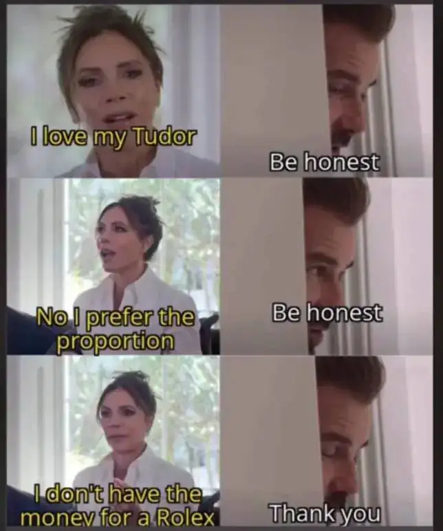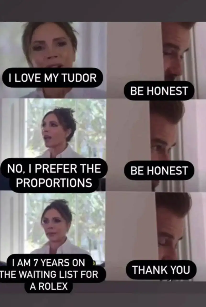 Más bien, a no ser que tenga un problema de otro tipo y que sea tratable.Dudo que algun dueño de un Tudor se sienta ofendido por este tipo de memes a no ser que se sienta identificado con la mujer del mismo.