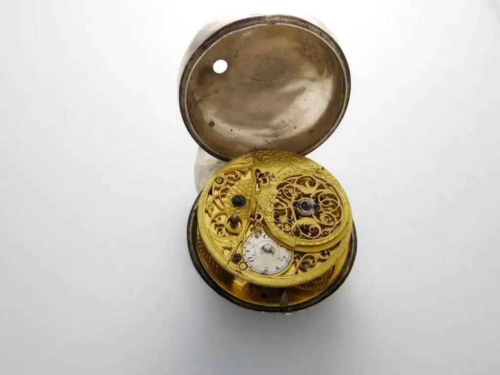 el regulador de la espiral, el disco numerado , se atribuye erróneamente a Thomas Tompion. pero en realidad ya estaba en uso en Francia y Suiza. la diferencia era que en el continente el disco era fijo y rotaba el árbol con una pequeña aguja mientras que en el sistema en uso en Gran Bretaña giraba todo el disco, como en este ejemplar, que quizás era para el mercado Inglés.
