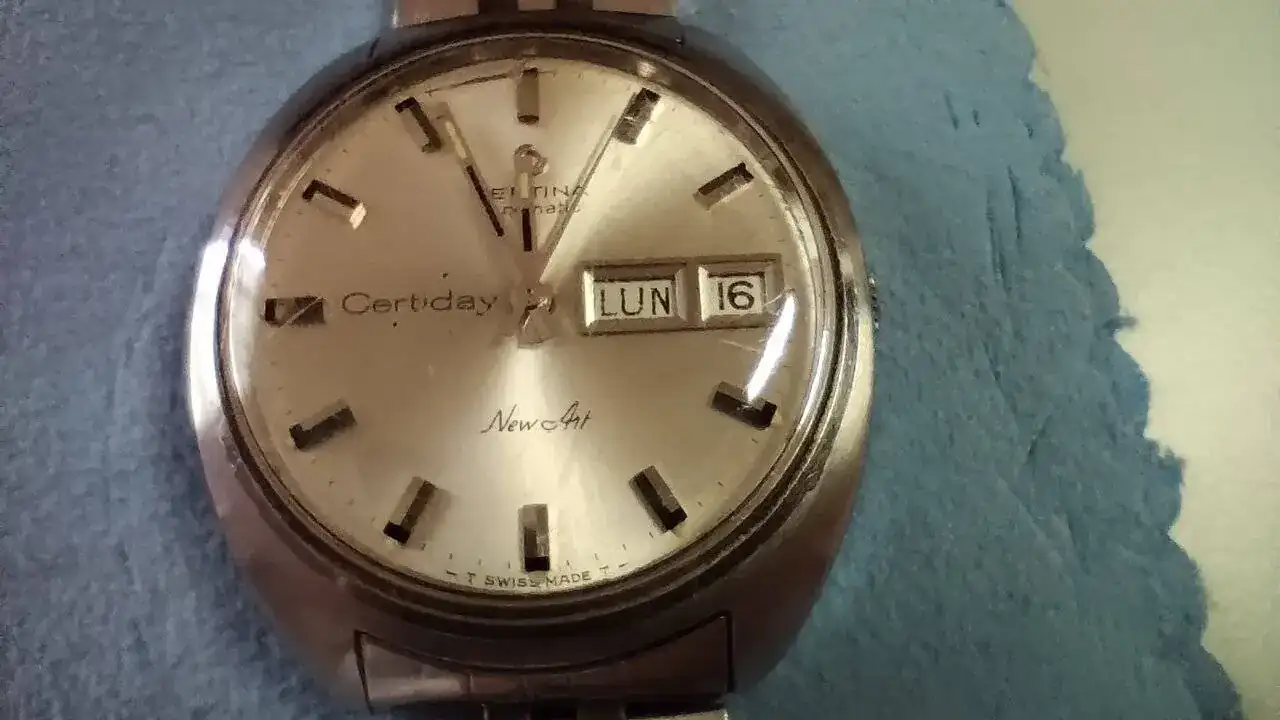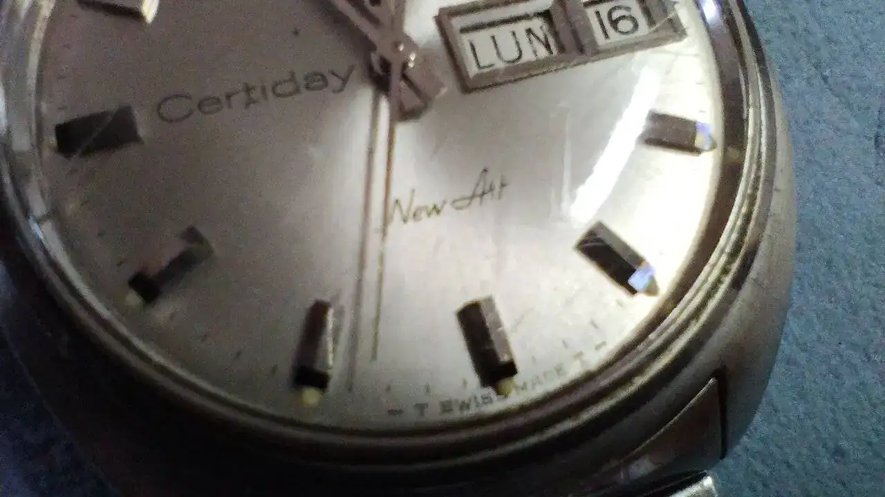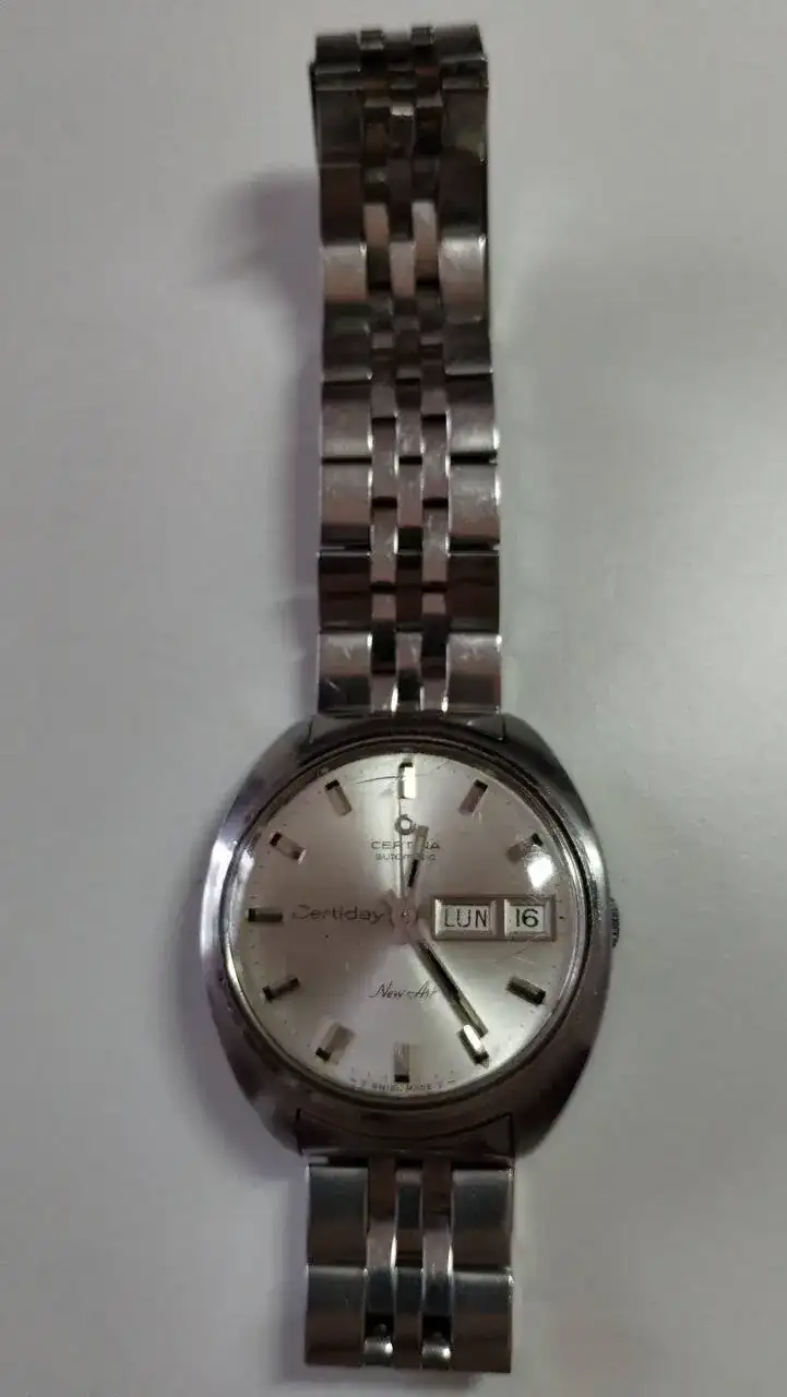 El modelo es Certina Certiday "New Art", muy bonito y llevable hoy día. Al primer meneo se puso a andar, no está mal para haber estado décadas parado. Eso sí, tuve que limpiar a conciencia el brazalete, que no he sido capaz de ajustar, y tampoco pude sacar la corona y no quise hacer el bruto. Pasará por el relojero y ya de paso que le eche un ojo y reciba un poco de puesta a punto. Y de ahí, a mí muñeca.