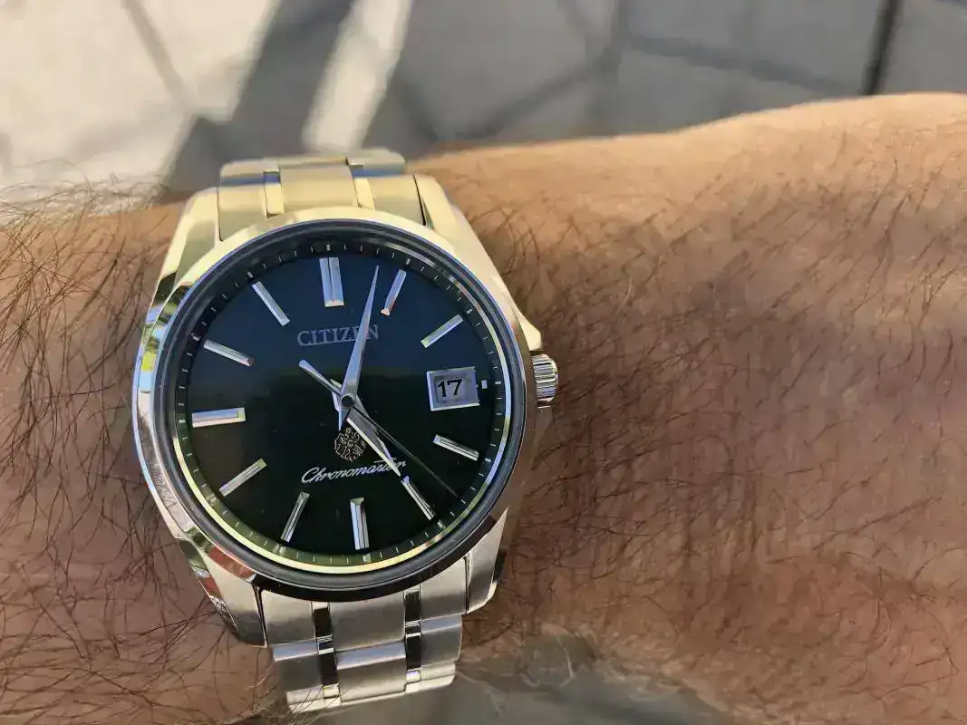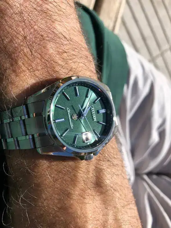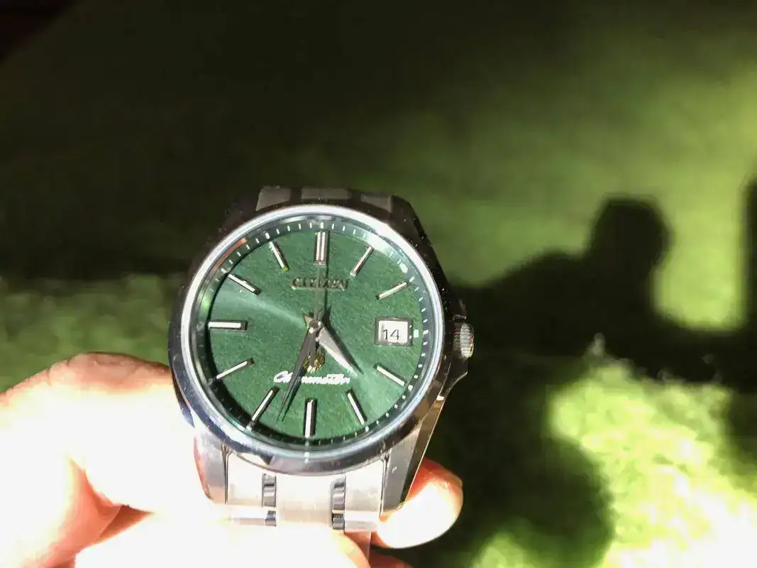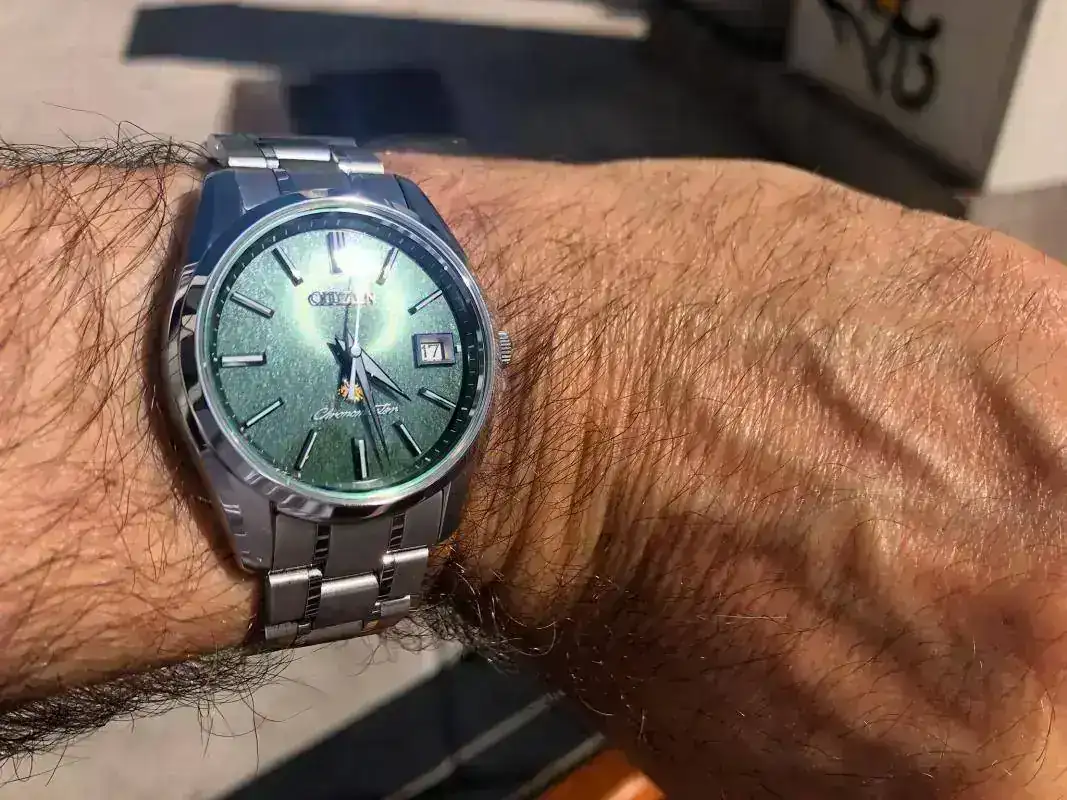 Se trata del Citizen Chronomaster AQ4020-54X. Lo que me atrajo, en primer lugar, fue su esfera de un intenso color verde, a la que me referiré luego; además, el color plateado de la caja y del brazalete y las manecillas tipo Dauphine, en un estilo que me recordaban a los Grand Seiko. El reloj forma parte de una edición limitada de 200 piezas. Se mueve por energía solar, por lo que su mantenimiento será mínimo o prácticamente inexistente. La precisión es de un máximo de cinco segundos de adelanto o atraso ¡al año! Caja y brazalete son de titanio pero de un titanio no color titanio, sino ligeramente plateado. Tiene calendario perpetuo hasta el año 2100 y no hay que preocuparse de actualizar el día del mes: el reloj reconoce los meses de 30 y de 31 días, y distingue los febrero de 28 o de 29 días si el año es bisiesto, y a las doce en punto de la noche cumple su cometido actualizando la fecha automáticamente. (Sí hay que ajustar la hora dos veces al año, en el cambio de horario). La garantía es de 10 años, válida en Japón, y en el resto del mundo de 1 año.