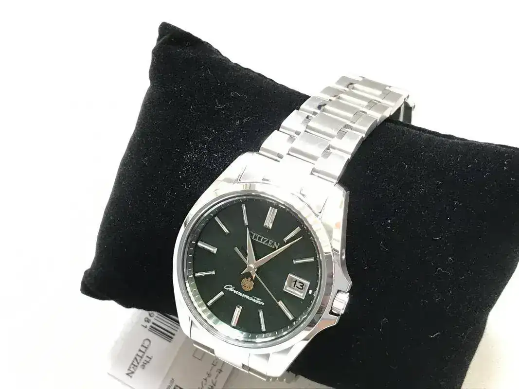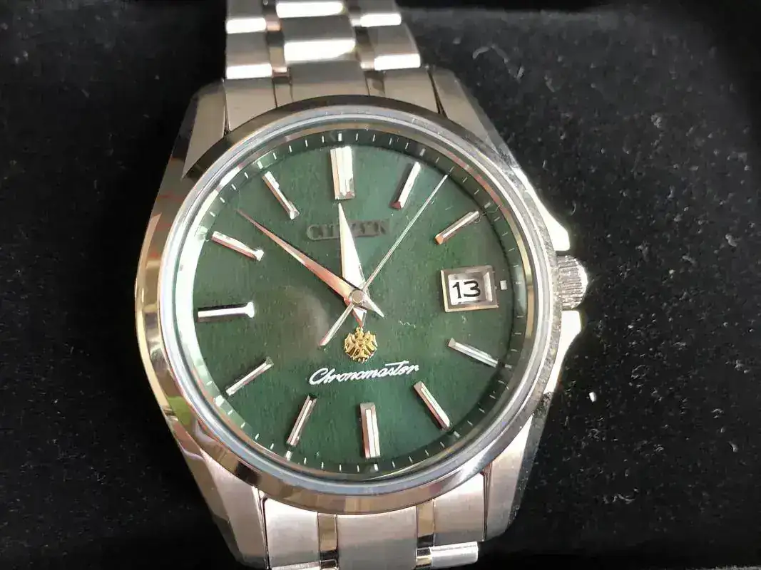 - El cristal es de zafiro y la esfera, como dije, del papel japonés «Tosa Washi» de color verde («Shenpeki», verde intenso inspirado en el jade japonés «Ryokuhekigyoku»). Los índices son plateados, en relieve, dobles a las 12, a las 6 y a las 9, con ventana de día del mes a las 3. A la pared, en vertical, están los marcadores de minutos/segundos pintados en blanco. Debajo de las 12, en relieve y plateado,«Citizen». Sobre las 6, el águila dorada en relieve (también aparece en un medallón en la tapa de la caja) y pintado en blanco «Chronomaster».