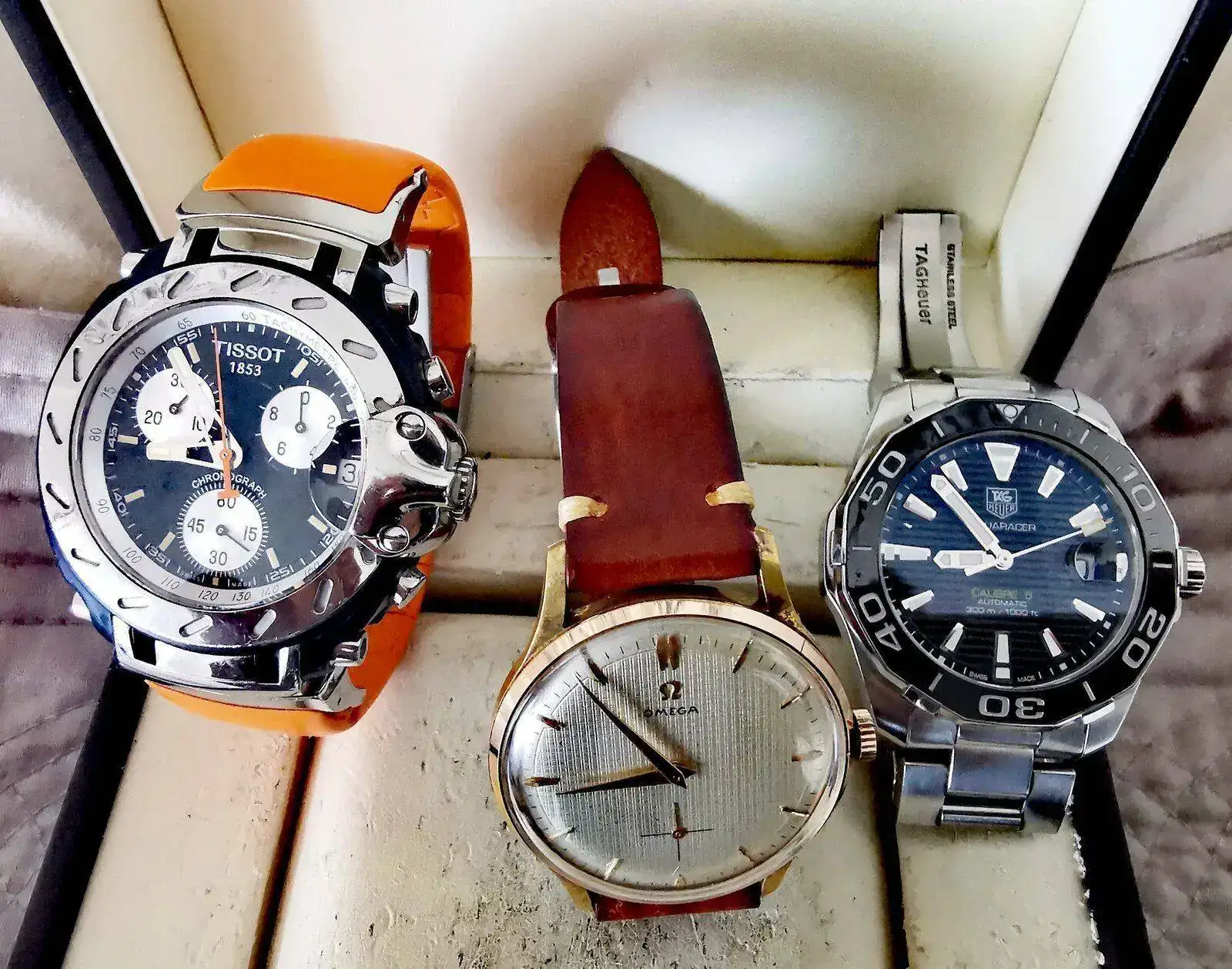 Omega vintage años 50 mecánico de cuerda manual calibre 267 37,5 mm, Tissot T Race de cuarzo edición moto GP de los 2000 de 38mm, y Tag Heur Aquaracer automático calibre 5 sellita Sw 200 bisel cerámico 41mm.