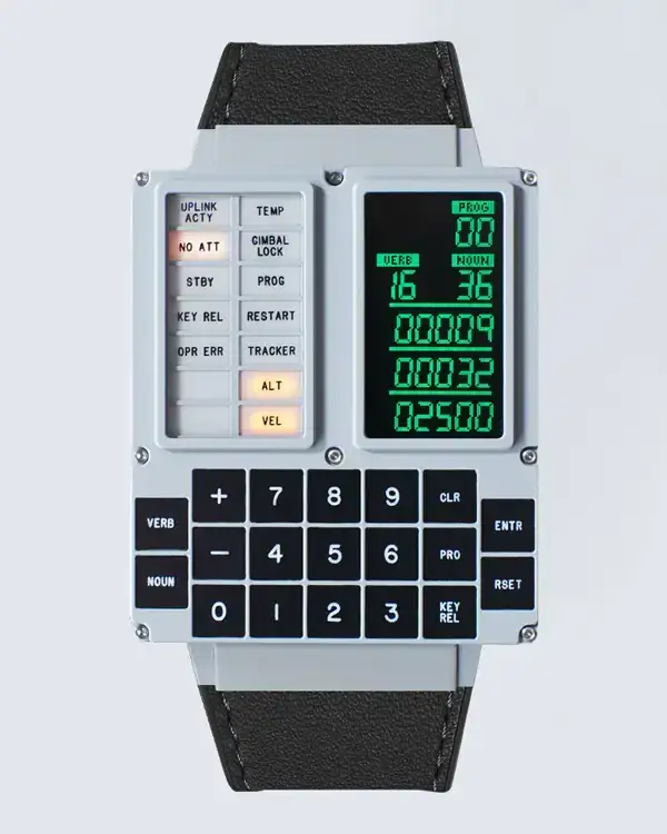 Es un reloj que reproduce la pantalla y teclado del ordenador de guiado del módulo lunar. Este es el diagrama del DSKY original:
