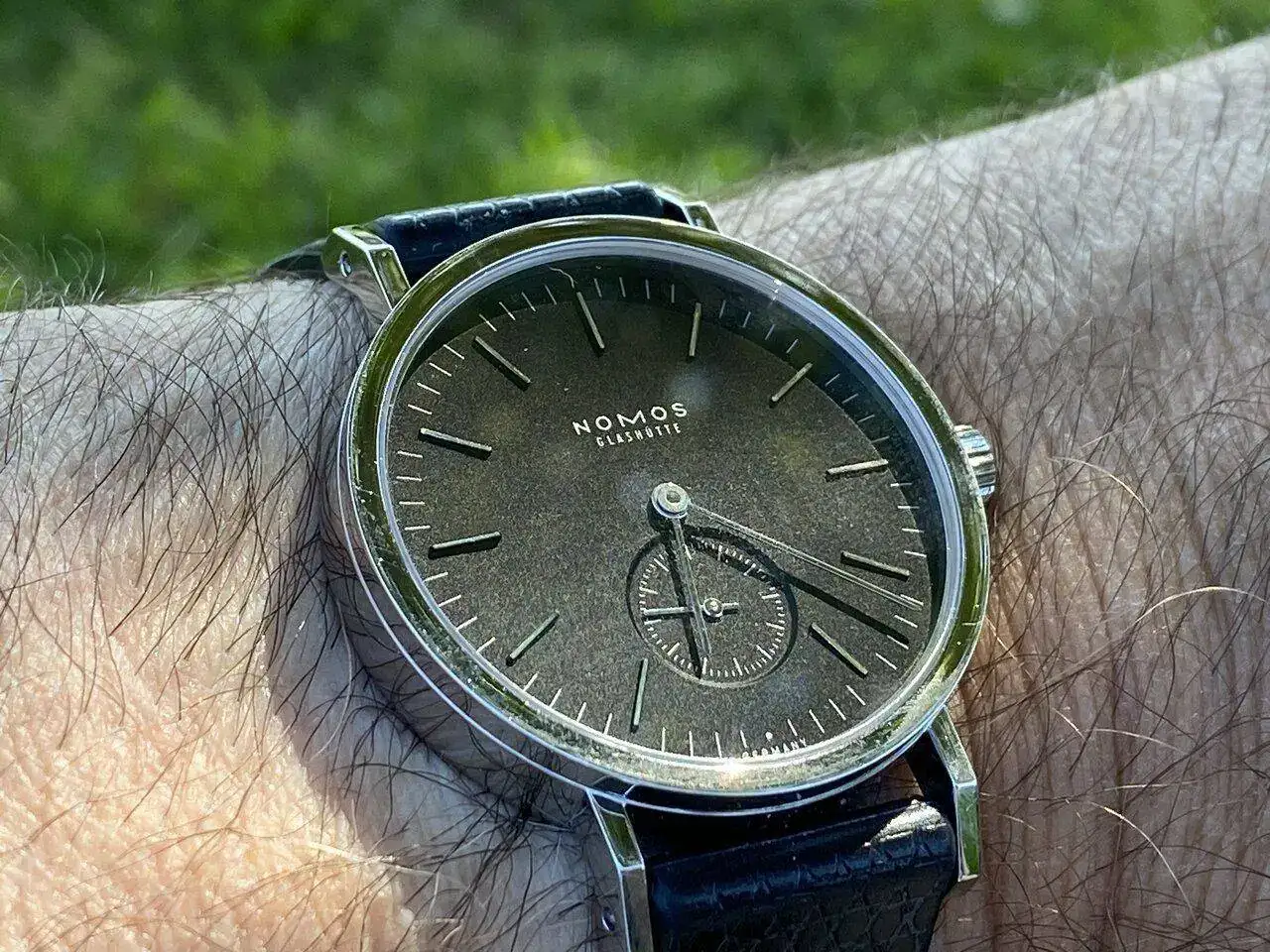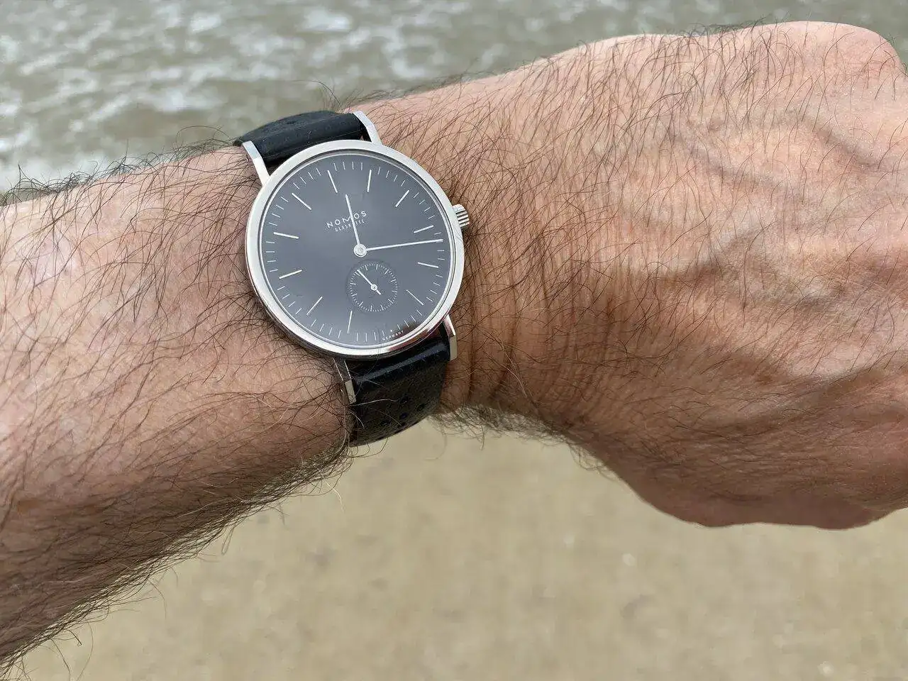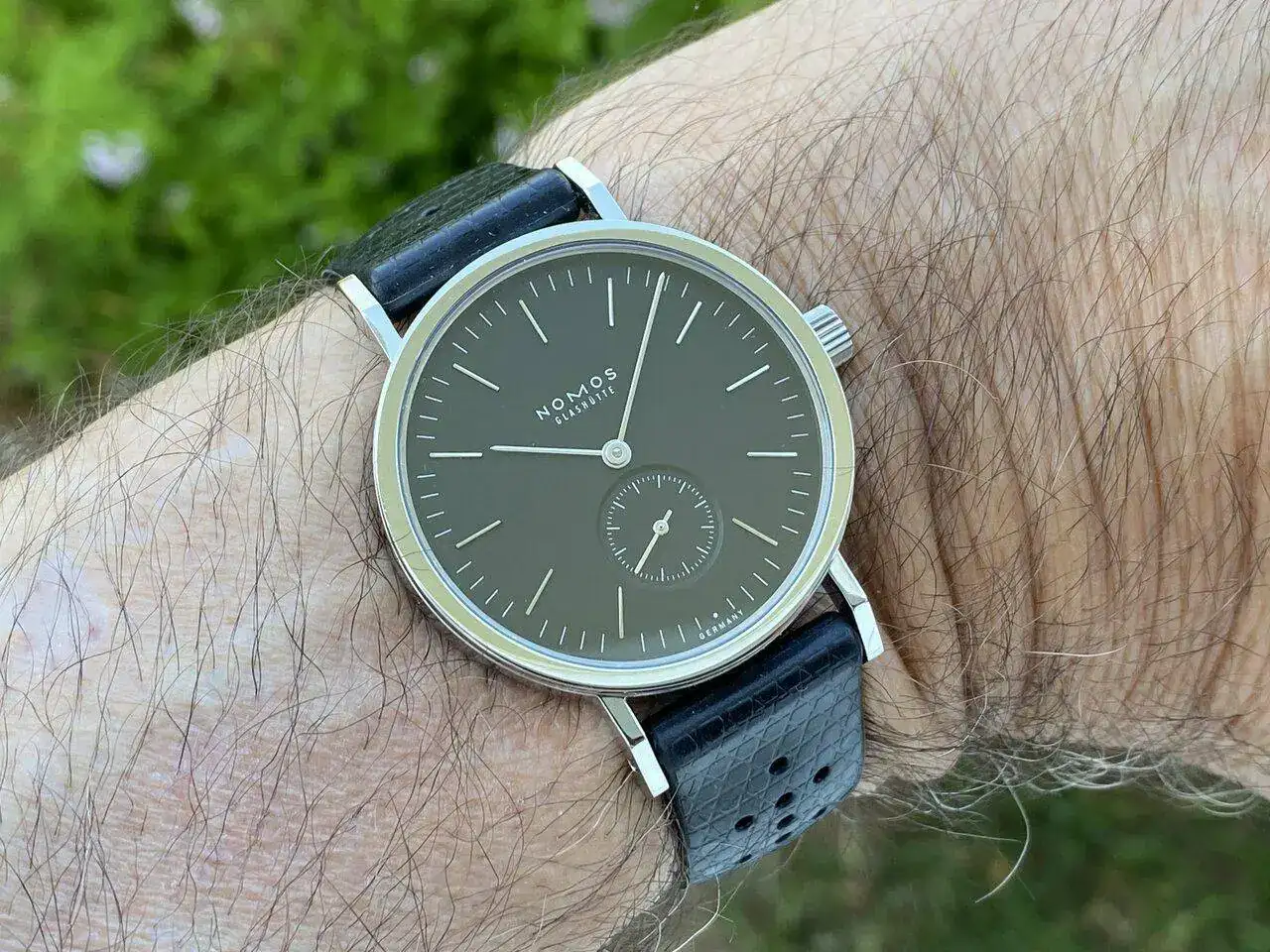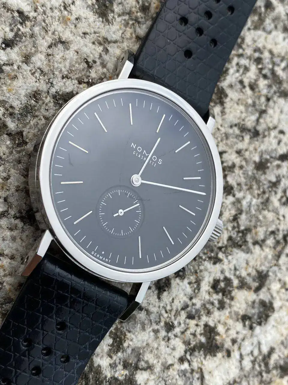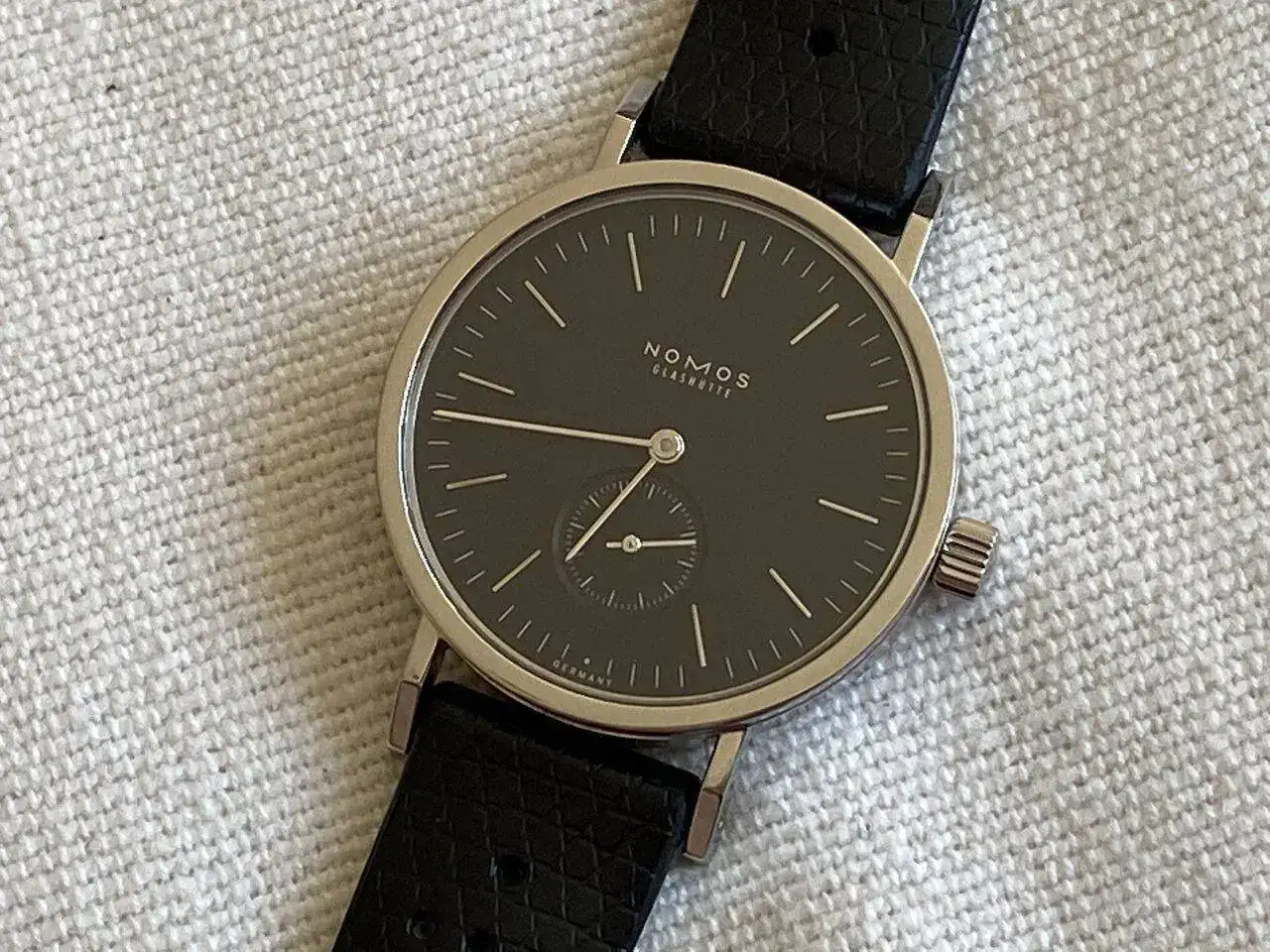 Lo más atractivo, estéticamente hablando, es para mí la perfecta combinación de dos únicos colores: por un lado, el negro antracita de la esfera y, por otro, el plata del acero pulido, que resplandece se mire por donde se mire: de acero pulido son los índices cada cinco minutos, que son aplicados o en relieve (los marcadores cada minuto están pintados de blanco); de acero pulido son las agujas -tipo bastón- horaria, minutera y segundero (el segundero, como es característico de casi todos los Nomos, viene en un subesfera a las seis, con marcadores pintados cada minuto, siendo más largos cada cinco minutos); de acero pulido es el bisel; y de acero pulido es toda la caja, incluidos los laterales y las asas. Incluso la tapa de la caja- atornillada con seis tornillos- espejea.