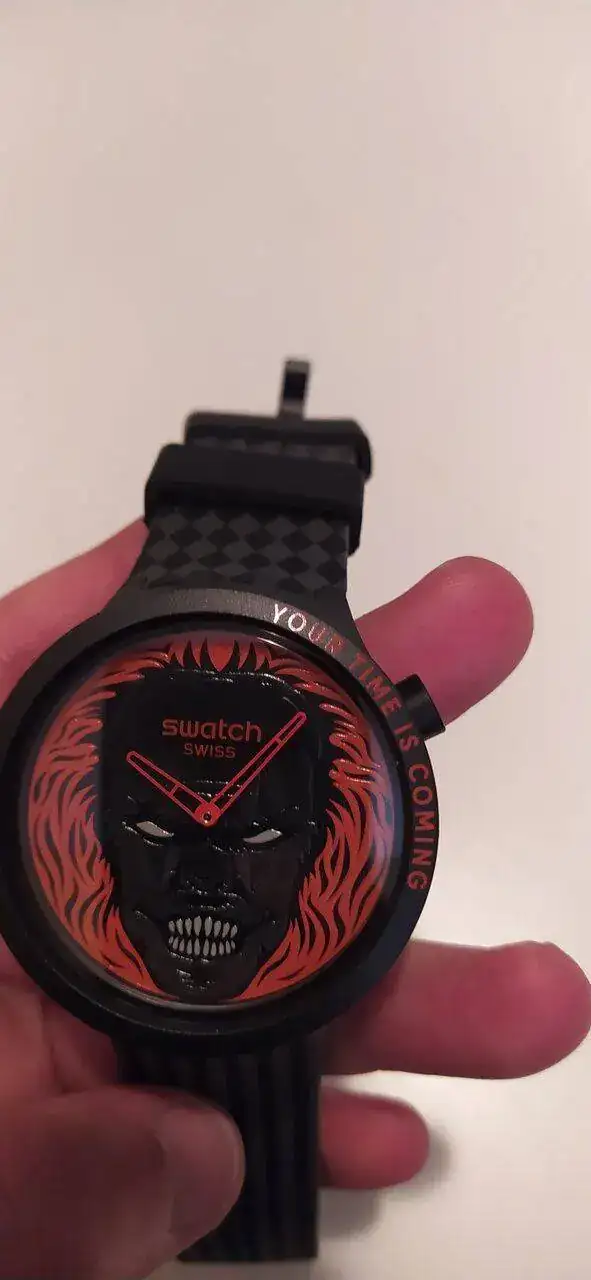 Pues es el Swatch Sb01b128 una edición especial de Halloween ( supongo). Lo vi esta mañana en la web, mientras miraba otro reloj para mi sobrino, y esta tarde calló después de verlo en la tienda.