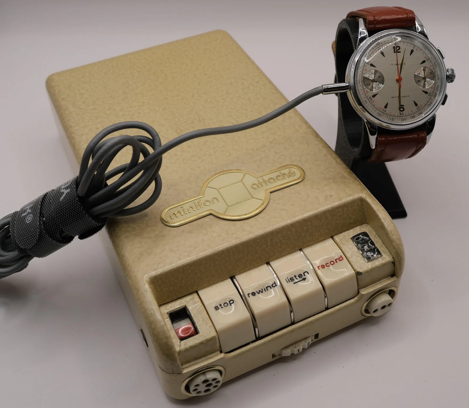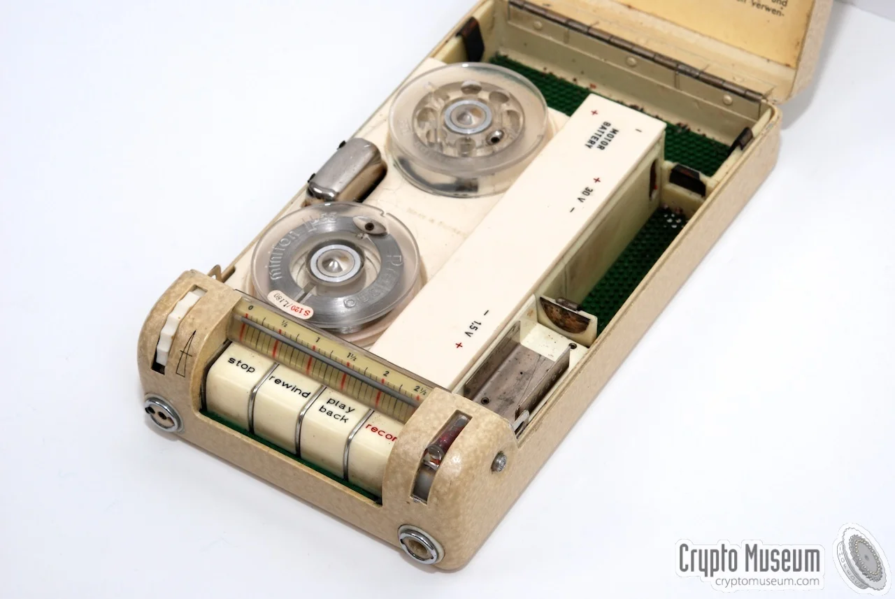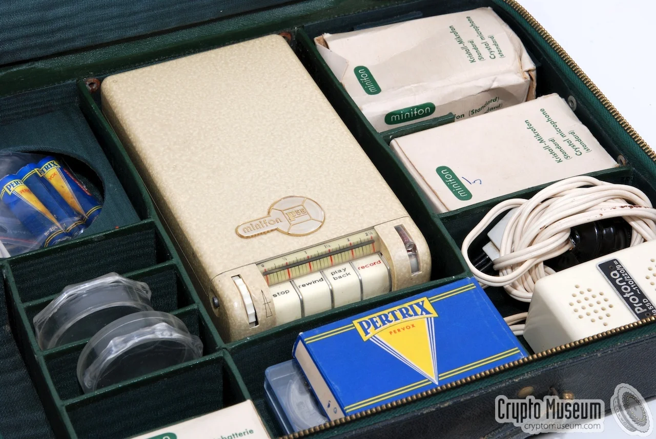 La Grabadora Protona Minifon P55 fabricada en Hamburgo entre 1955 y mediados de los 60, era el cerebro de la operación, podía grabar entre 2 y 5 horas de audio.