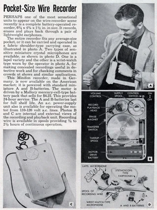 Se diseñó para conectarse mediante un cable discreto a una grabadora de alambre o cinta portátil que el usuario llevaba escondida, permitiendo grabar conversaciones de forma encubierta.