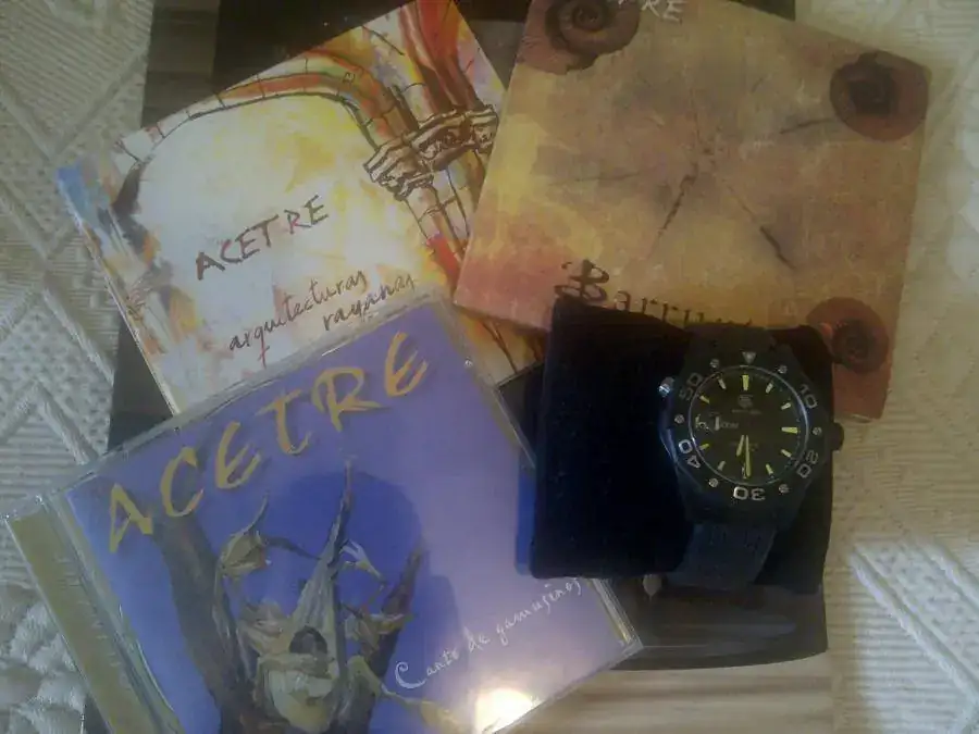 Magnifico hilo... hasta ahora me habia quedado embobado mirando portadas y recordando música y ahora me activo un poquito para enviar alguna foto yo tambien. Ya se que esto que pongo no tiene nada que ver con la corriente rockera que estais poniendo ( de la que soy adicto yo tambien ), seguramente sólo algun extremeño perdido los conozca pero son realmente recomendables, con un sonido exquisito. Antologia del folk nº1 por Acetre. A su lado mi Aquaracer full Black... este reloj sólo me lo pongo cuando voy a verles actuar... mi chica toca con ellos...:. Un saludo.