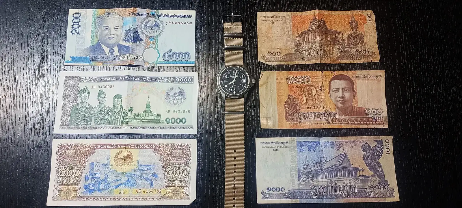 Izquierda Kips laosianos, centro el Hamilton que me acompaño y derecha Reels camboyanos.