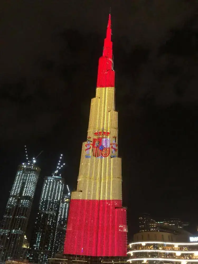 + Bonus: hace poco proyectaron la bandera de España por "mi tierra", en el edificio más alto del mundo, Burj Khalifa (828 metros). Dependiendo del día y la hora, los precios por anunciar o proyectar algo sobre el edificio varían entre AED 250.000 y AED 1.000.000, que al cambio son entre 60.000€ (por 1 proyección de 3 minutos) y 250.000€ (por 5 proyecciones de 3 minutos a lo largo del día).
