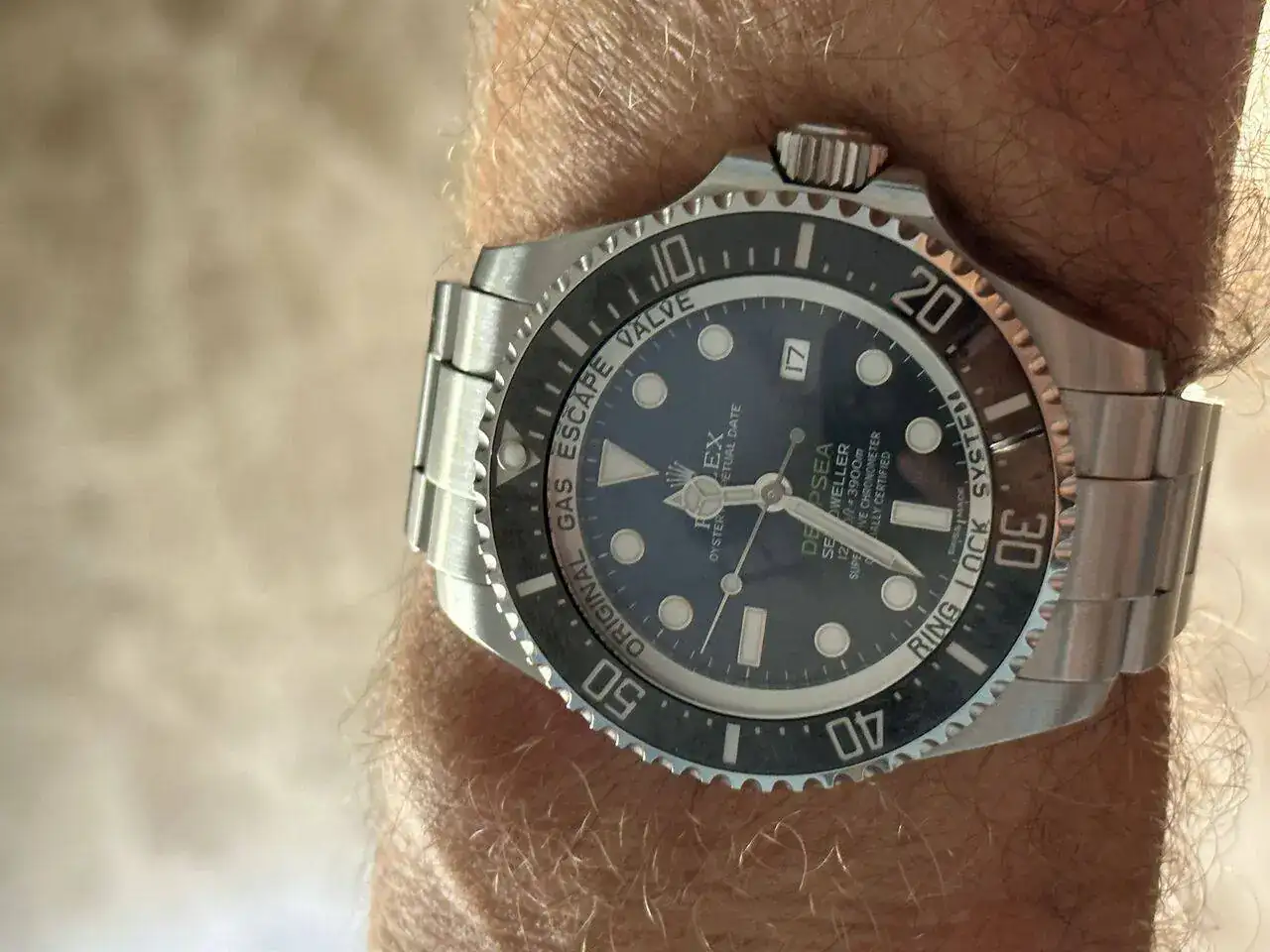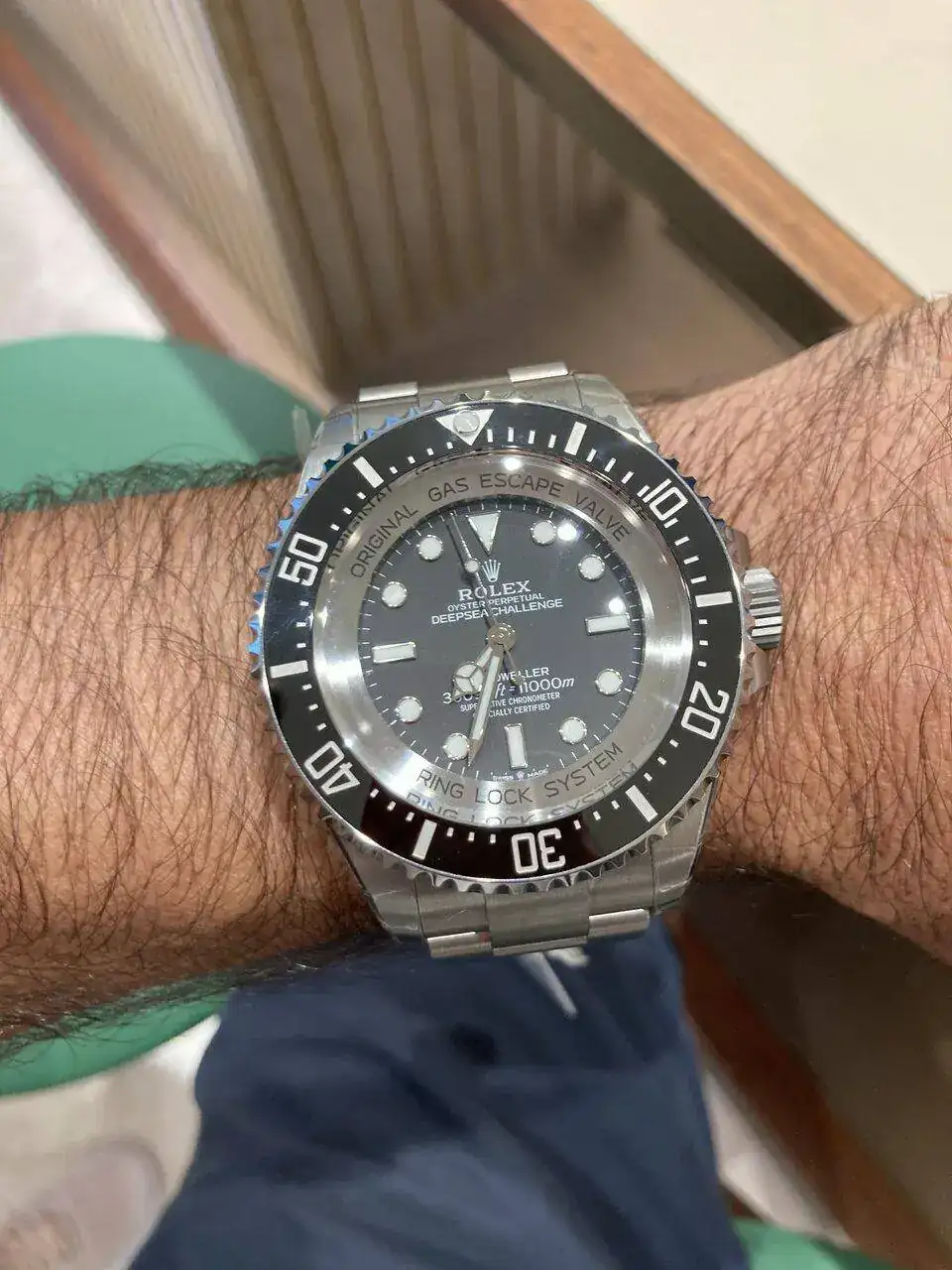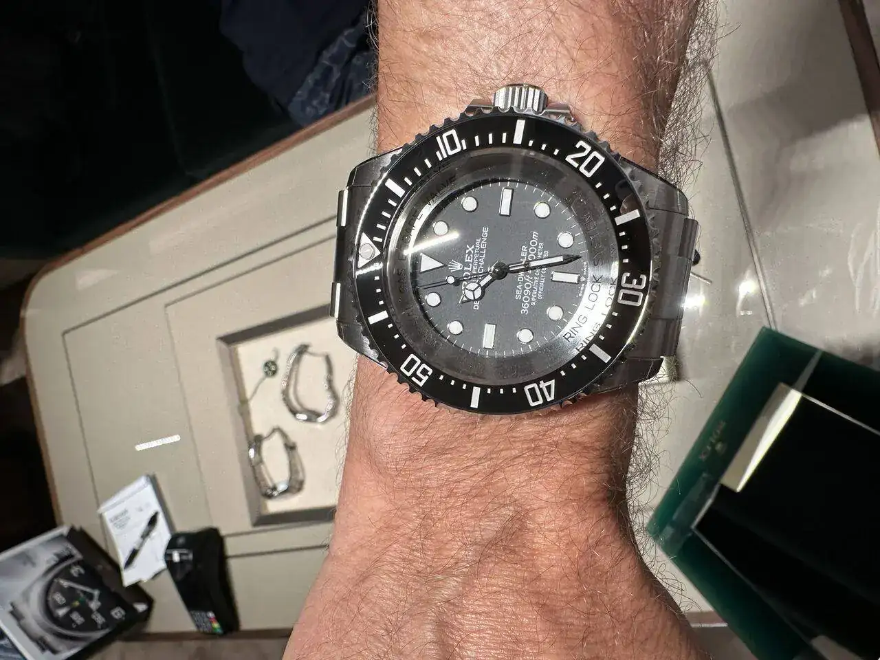 No se ve tan grande como el Deepsea Challenge que se supone que es 50 mm. desde luego no es la mejor posicion la foto que tomé del Rolex pero os aseguro que se veía enorme, mucho mas grande que este