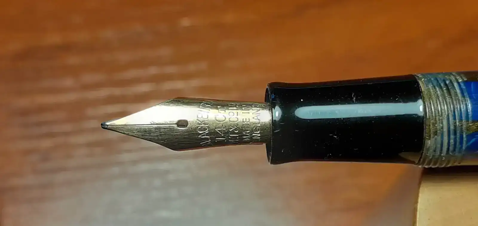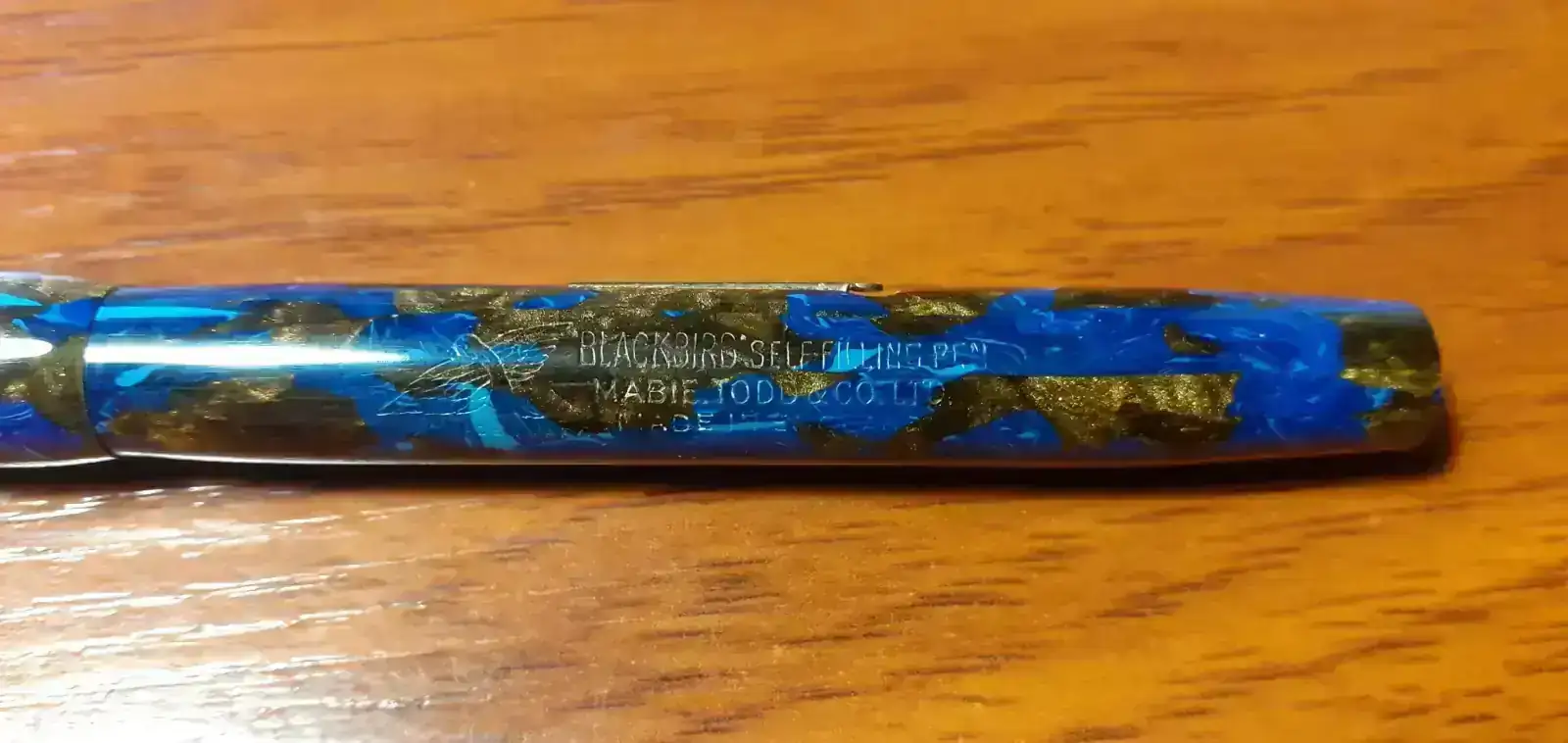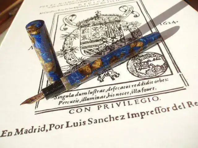 Hoy presento una preciosidad: una Mabie Todd Blackbird "oriental blue". La gama Blackbird era el modelo inferior de Mabie Todd tras las Swan. Es un modelo pequeño que se fabricó desde 1911 hasta el fin de la marca, con variadas formas, materiales y colores. Esto las ha hecho muy coleccionables. En el "penshow" de Madrid es una gozada verlas en las mesas de los expositores británicos. Esta que presento se fabricó a finales de los 20 y principios de los 30. El color es una maravilla: el azul hace volutas a lo Van Gogh, y lo que en la porquería de foto se ve marron es un dorado oscuro con irisaciones, como arena dorada en el fondo de un rio. Esta decoración se puso bastante de moda esos años entre los fabricantes de plumas, y como ejemplo están las famosas "Patrician" turquesa de Waterman, Chilton, etc. y en cualquier marca es muy buscada. El plumín, de oro de 14ct, es un fino-medio flexible, tamaño 2, como queda reflejado en el grabado del culote: BB2/46. Es muy agradable escribiendo, y alguien menos torpe que yo con los plumines muy flexibles disfrutaría como un enano.