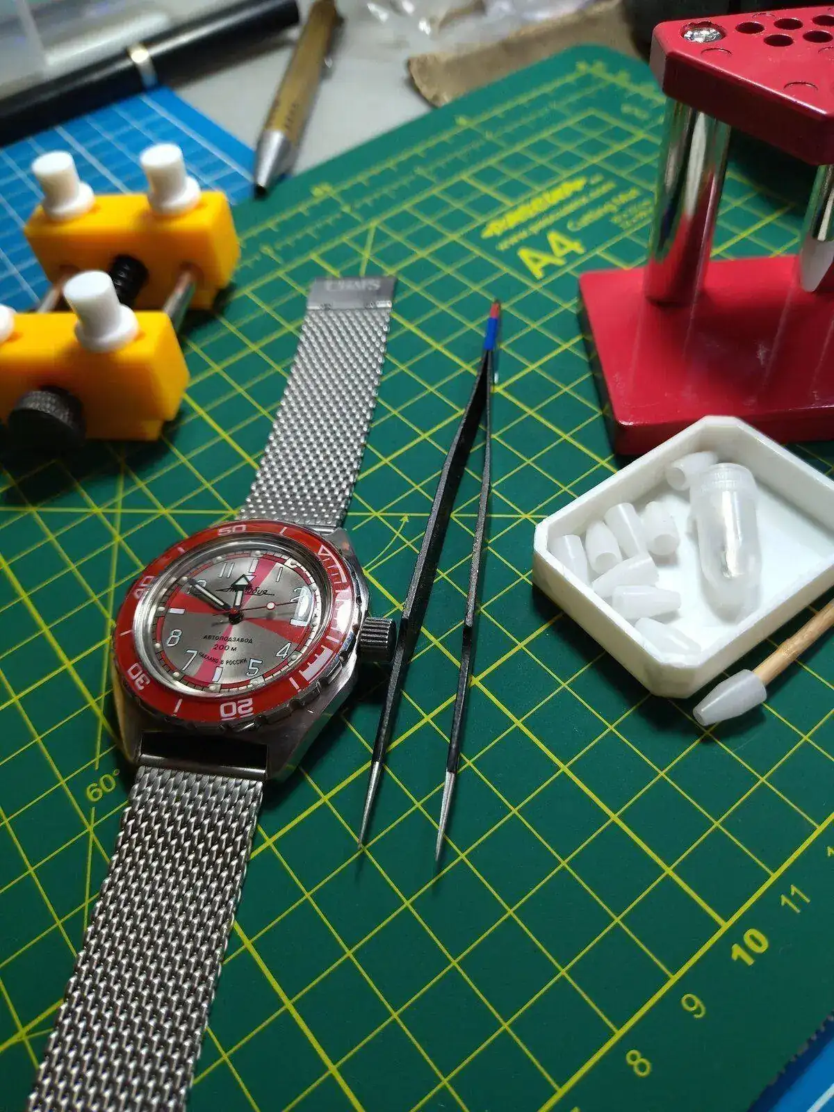Yo tambien he abierto rusos con unas tijeras, con unas pinzas de punta finita (las buenas, pues unas chinas les doblé las puntas en la maniobra), y ahora con una llave , pero me acomodo mejor con unas tijeras, cosas de los rusos.Ya que esto va de confesiones yo uso un extractor de agujas cutre comprado en un pack de herramientas en eBay y uso de protector el plástico de las bolsas dónde vienen los diales, pero el otro día se me cayó la secundera de un komandirskie, las únicas que había llevado a cambiar un relojero por ser mi primer mod, y me di cuenta estando en el trabajo, mi impaciencia no me permito esperar así que abrí el reloj con unas tijeras y puse la secundera con el dedo y la apreté con un lápiz, ya había aprendido de un camarada del foro que no recuerdo, que para los komandirskies hay que apoyar el mecanismo en una superficie plana y dura cuando coloques la secundera para que no te la escupa y listo.Ver el archivos adjunto 2322793Ver el archivos adjunto 2322794p