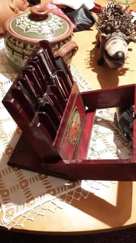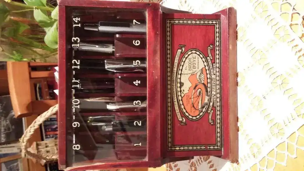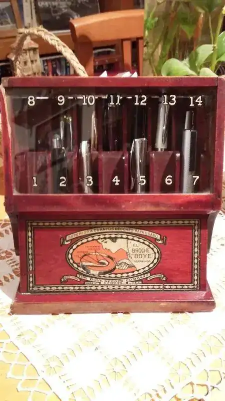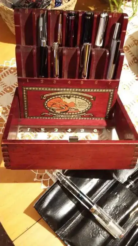 Pues eso, que en una ladina estrategia para introducir a mis pequeñas en espacios comunes, me puse a buscar una caja que pudiese ser del gusto de mi MDD por alguna razón. Encontré este antiguo expositor de tienda para agujas de ganchillo y después de pensarlo un poco hoy me ha llegado. Presenta sus problemas (en la fila trasera sólo caben plumas de hasta 13 cm y si las piezas de calibre grueso, como una Delta, no entran) Sin embargo, me encanta y, sobretodo, le encanta a mi MDD.