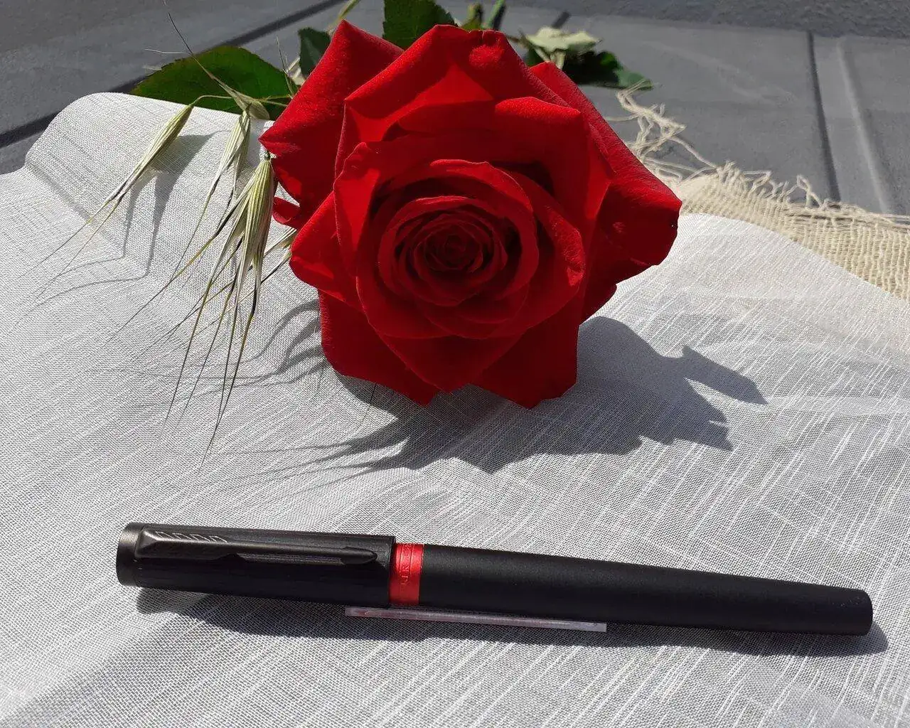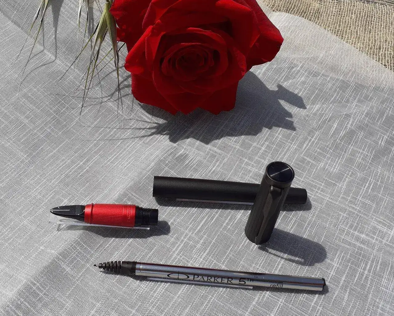 Cuando yo la descubrí no recuerdo que se llamara Parker del 5º elemento, simplemente era una Ingenuity, pero hace tanto tiempo que quizás lo haya olvidado. La cuestión es que esperé a que viniera mi marido a buscarme a la feria después de comer y me planté con él delante de la mesa con la intención de regalársela pero prefirió un boli que originalmente llevaba un subrayador. Al final no pude resistirme y compré la Parker 5TH Ingenuity deluxe slim negro-rojo.