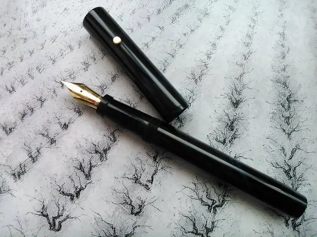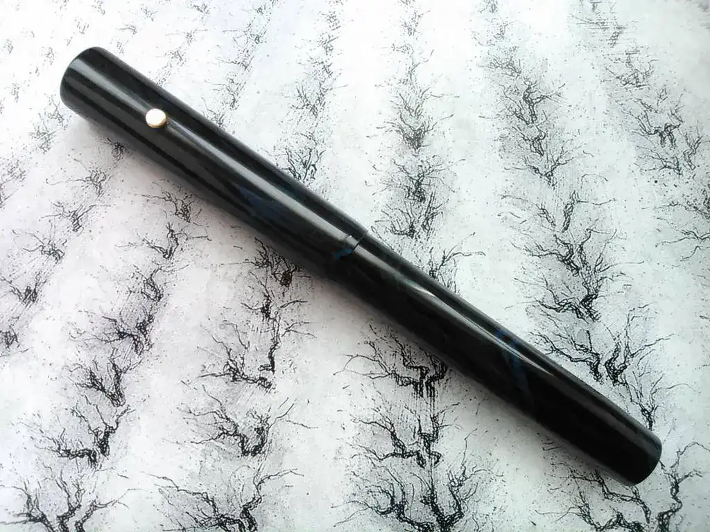 La idea base es el tipo de las LeBoeuf de los años treinta: grandes plumas con plumines asesinos. Elegí que fuera lo más desnuda posible. Los únicos adornos son la "lenteja" en el capuchón y la cruz de Clavijo grabada en lo alto del mismo. En las fotos no se aprecia bien, pero la ebonita es de un tono azul oscuro con vetas azul-verdosas.