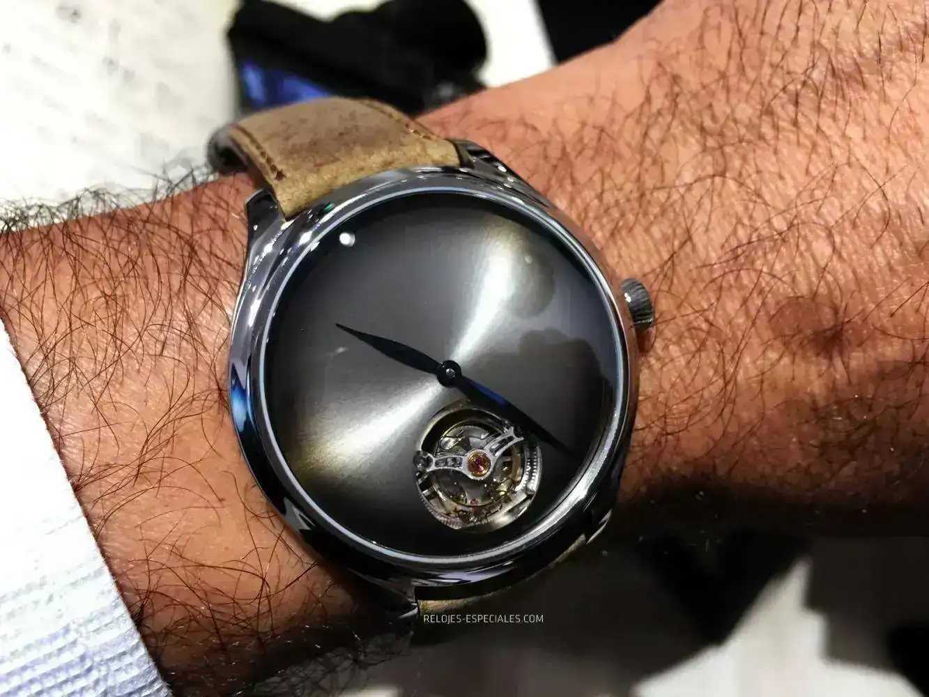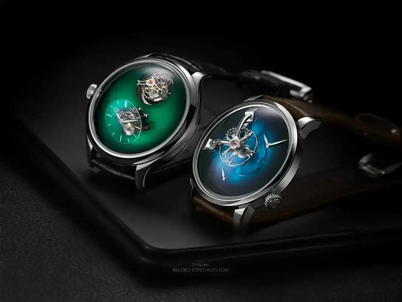 Pues bien, ambas marcas presentan novedades "contagiadas" la una de la otra. Si MB&F se beneficia de espirales y, por primera vez, de las esferas "fumée" típicas de Moser, esta ultima adopta códigos estéticos de la otra para presentar su espectacular tourbillon cilíndrico dentro de una jaula igualmente cilíndrica y bajo una bóveda de zafiro.
