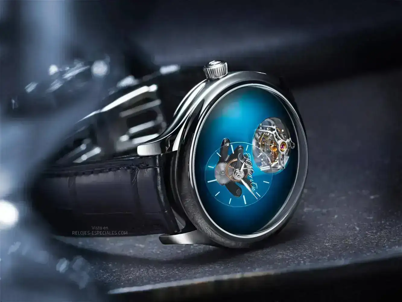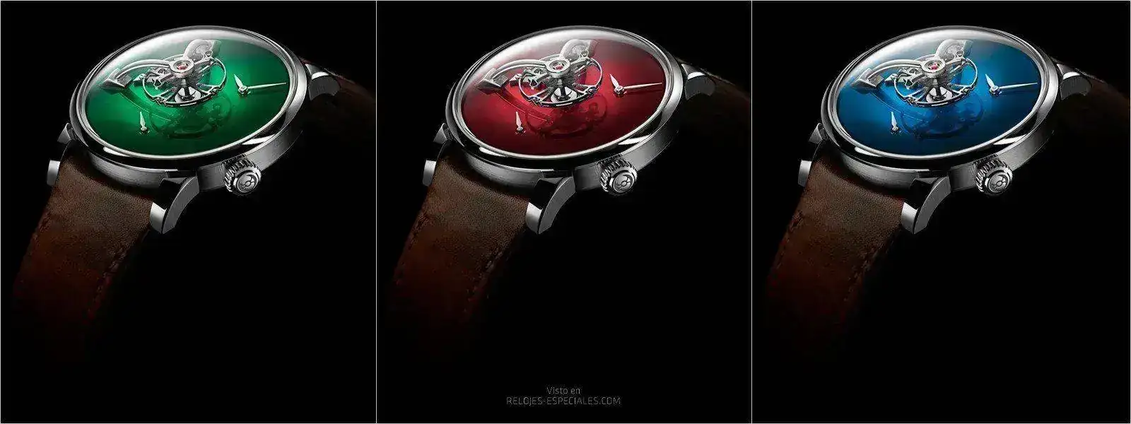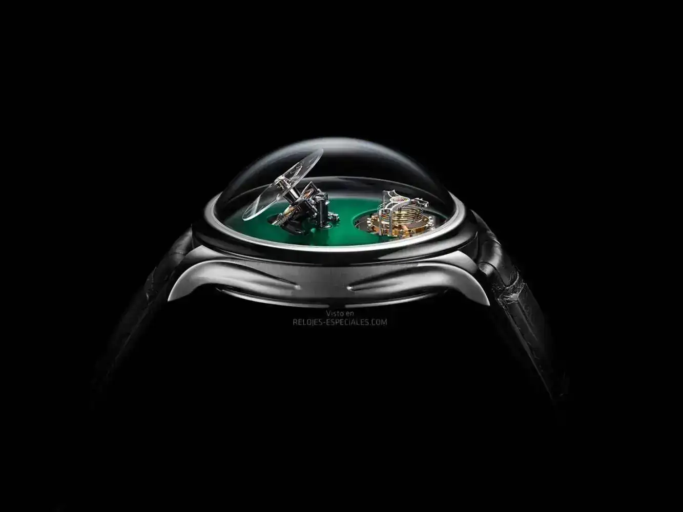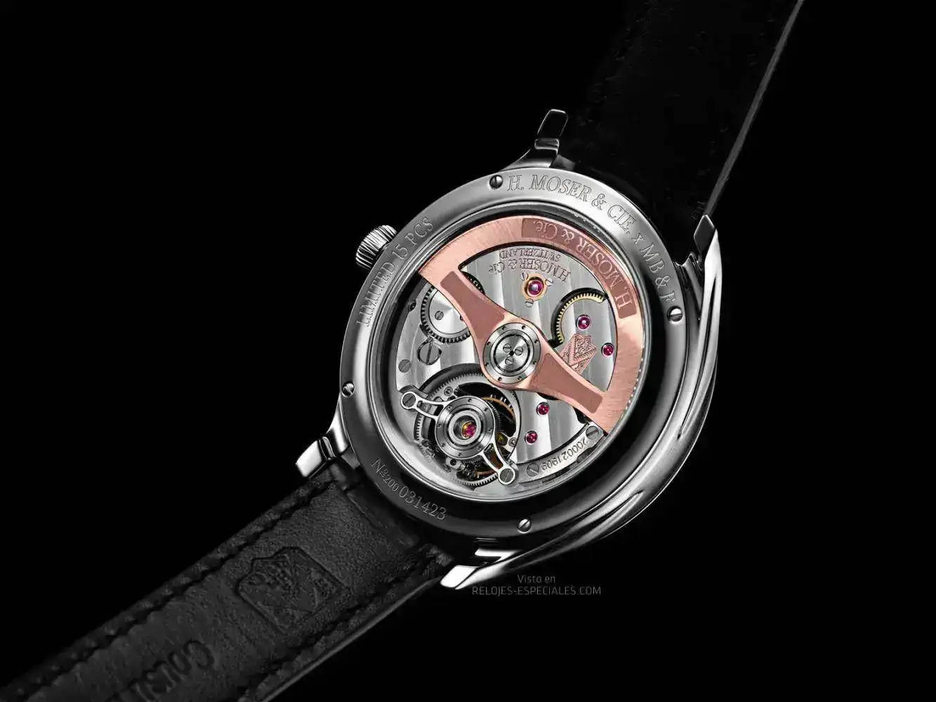 Por su parte, el Endeavour Cylindrical Tourbillon H. MoserxMB&F toma prestado uno de los elementos más distintivos de MB&F: el concepto del movimiento tridimensional protegido por una cúpula de zafiro. El espiral del tourbillon volante de un minuto que sobresale por encima de la esfera principal a través de una apertura ventricular situada a las 12 horas ha sido suministrado igualmente por Precision Engineering AG y es idéntico al que se diseño para la LM Thunderdome de MB&F. El espiral cilíndrico, que fue inventado en el siglo XVIII, recuerda en cierto modo a un tornillo sin fin o un sacacorchos, y se alza perpendicularmente alrededor de la tija superior del eje del volante. La principal ventaja que ofrece es que se desarrolla concéntricamente y, por tanto, geométricamente, puesto que actúa perfectamente a lo largo de los ejes de sus pivotes. Esta característica supone una ventaja considerable con respecto a los espirales planos, cuyos extremos opuestos tienden a ejercer fuerzas sobre los pivotes pese a que las curvas terminales Philips o Breguet se diseñaron específicamente para corregir parcialmente la apertura no concéntrica del espiral. Otro de los elementos distintivos de MB&F son las esferas inclinadas que H Moser & Cie integra como subesferas de las horas y los minutos. Las esferas presentan una inclinación de 40° y se encuentran instaladas sobre un tren de engranajes cónicos que garantiza una transmisión óptima del par de un plano a otro. Como para llevar la contraria, el Endeavour sí luce el nombre de H. Moser & Cie en esa pequeña esfera transparente a modo de marca de agua. Cinco ediciones limitadas (según color de esfera) a 15 ejemplares cada una.