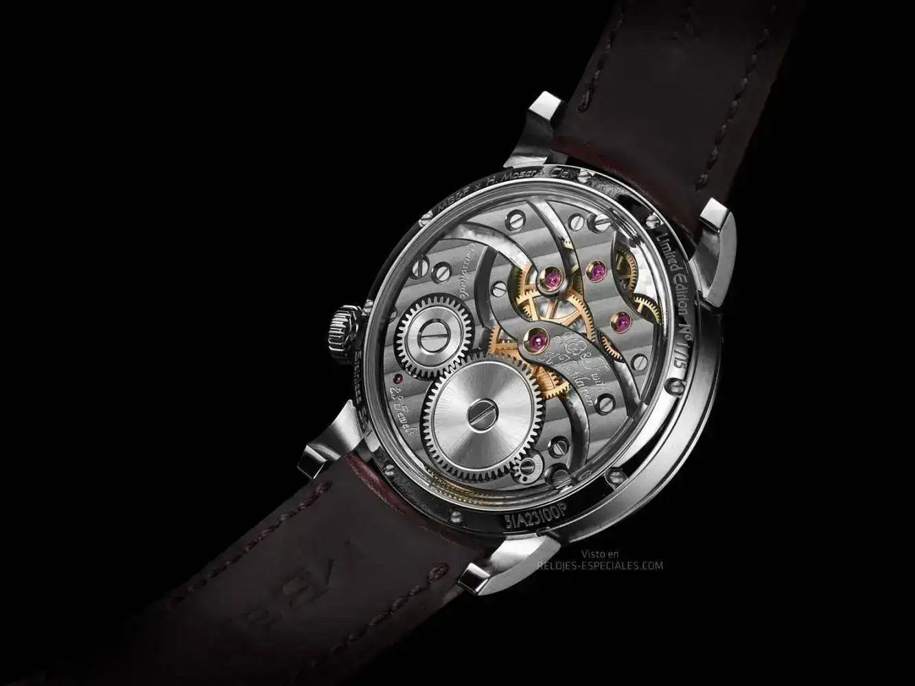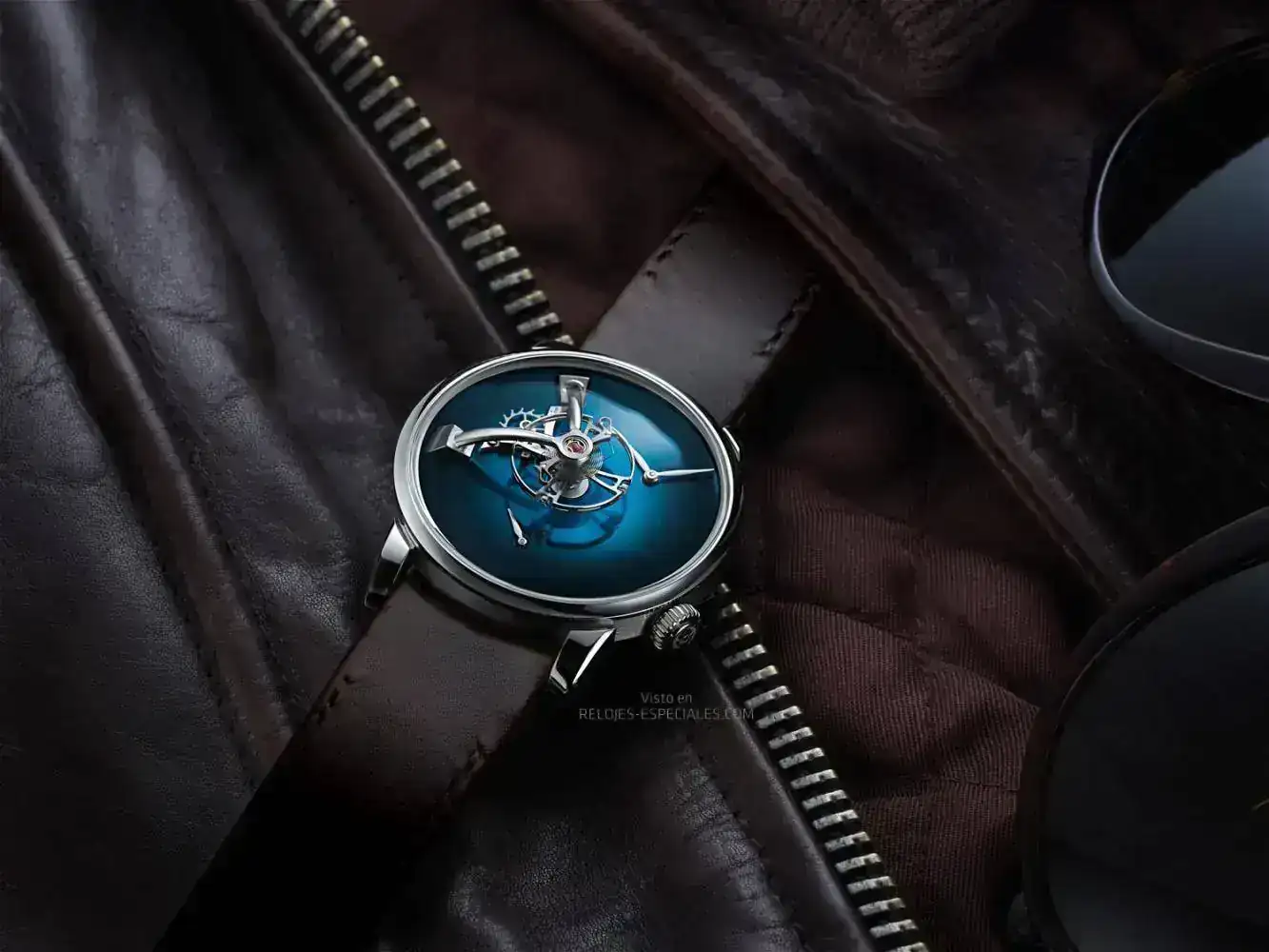 Así, la reinterpretación de la LM101 MB&FxH. Moser (LM por Legacy Machine) sigue la estela de los relojes Concept de Moser y renuncia a su propio logotipo en la esfera, recuperando la época en que los grandes relojeros sólo firmaban en el calibre. Además, y en pos del minimalismo, se ha prescindido de las subesferas flotantes abovedadas para indicar las horas y los minutos, así como de las agujas dispuestas en la esfera principal mediante las que se indicaba la reserva de marcha de 45 horas. Se mantiene, eso sí, el volante suspendido de gran tamaño, que sigue ocupando el lugar de honor aunque se ha reinterpretado por completo para enfatizar el encanto de las esferas ahumadas de color Red, Cosmic Green, Aqua Blue y, por supuesto, el célebre Funky Blue. Este volante está está dotado de un doble espiral producido por Precision Engineering AG. Gracias al doble espiral se corrige el desplazamiento del centro de gravedad que experimenta cada muelle espiral al expandirse y se mejora considerablemente la precisión y el isocronismo. El fondo visto de zafiro curvado permite ver el calibre creado por Kari Voutilainen a partir de las ideas de Maximilian Büsser. Cuatro ediciones limitadas de 15 unidades por color de esfera, una de ellas (la Aqua Blue) exclusiva para el mayor distribuidor saudí: Ahmed Seddiqi & Sons