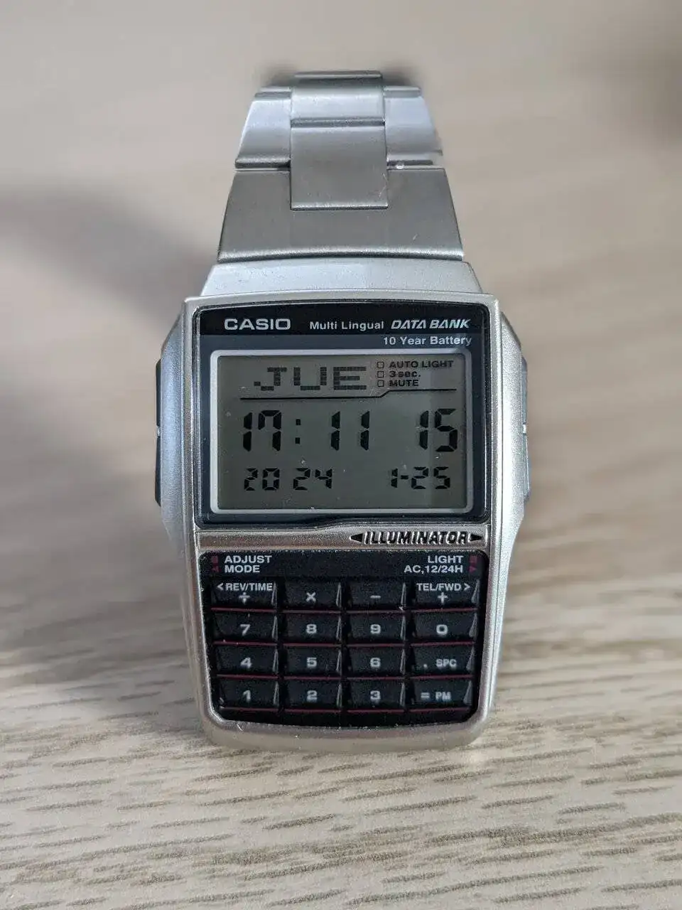 El segundo sería el Casio DBC-32D-1AES. PROS: Calculadora, Databank para almacenar contactos, buena resolución de pantalla aunque peor que el world time, calculadora, 10 años de batería, luz automática al mover la muñeca y diseño aún mas llamativo que el anterior. CONS: No es WR! ni siquiera para salpicaduras...eso me limita mucho su uso...El cierre no es deployante, es a presión y además tanto la carcasa como los botones son muy plásticos y la sensación de calidad es la peor de los 3: