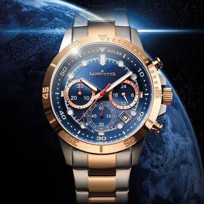 SOLARIS es una obra de arte creada por los maestros relojeros de Lanscotte para el hombre que exige precisión e innovación por encima de todo. Su caja de resistente Acero quirúrgico y antialérgico 316L, función Cronógrafo, esencial para el hombre que vive intensamente, acabado selectivo en Oro Rosa de 1ª Ley mediante tratamiento IPRG, prácticamente inalterable… Y su extraordinaria maquinaria: pura energía solar. Inagotable.
