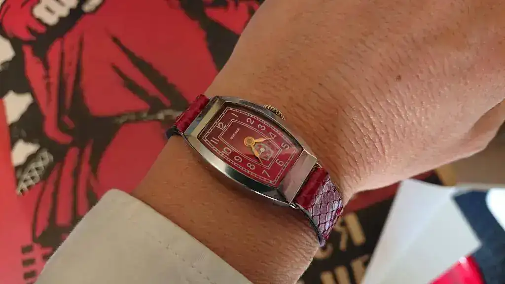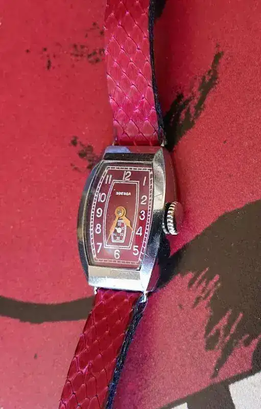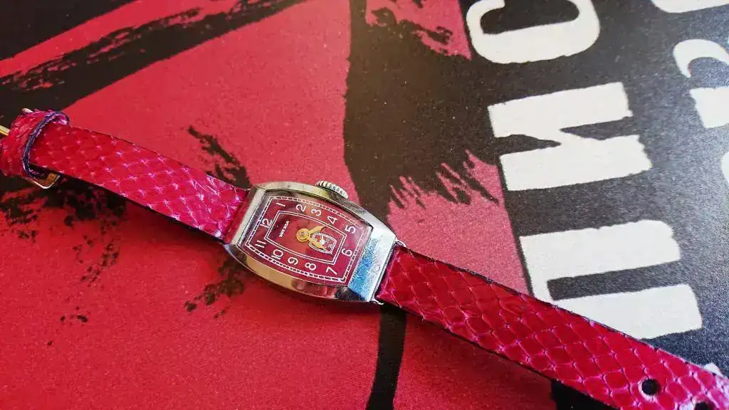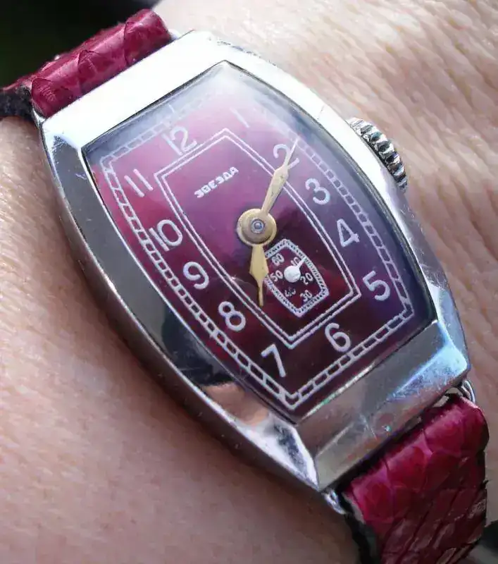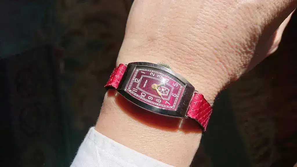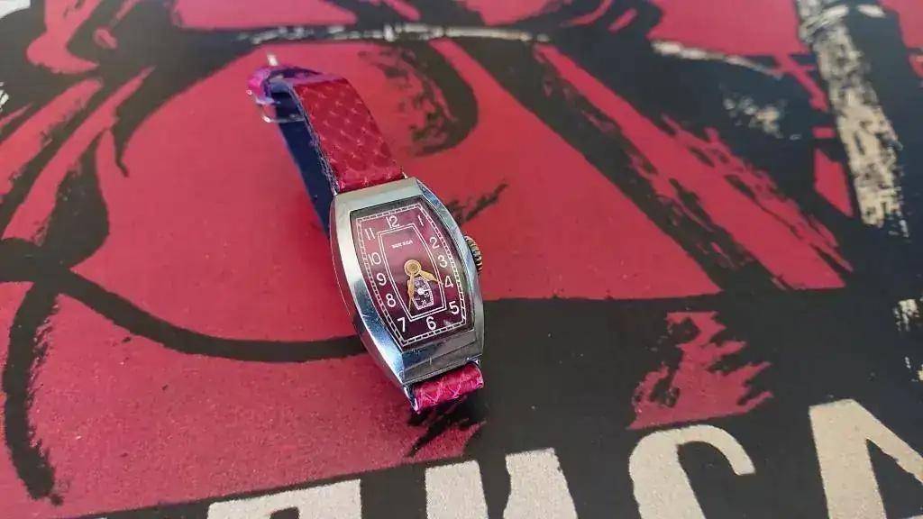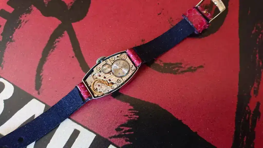 Seguramente os parezca una frivolidad, pero su aspecto exterior me cautivó nada más verlo. Me gustan mucho los relojes art déco y el color guinda de la esfera me chifla, pero es que la combinación de ambas cosas me tiene fascinada. Estoy habituada a ver estos colores tan vistosos y llenos de matices en los relojes setenteros, pero no en piezas anteriores y con este diseño