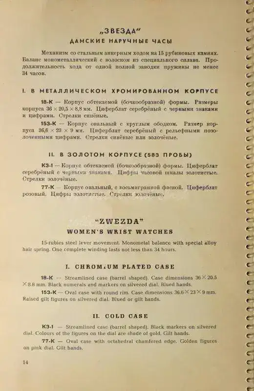He leído que los Zvezda (Estrella) se fabricaron entre los años 40 y los 60 en tres fábricas: Pensa, Petrodvorets y Uglich. También he visto en un par de fotos de un catálogo de 1953 que los describen como relojes de dama