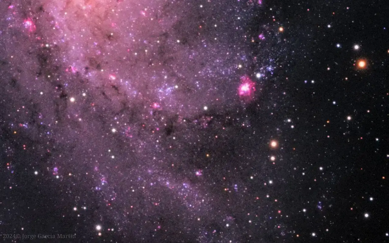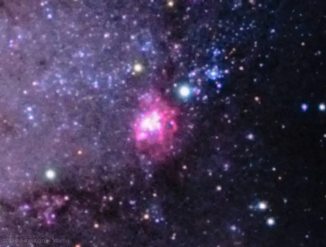 Cuando hacemos astrofotografía de nebulosas en general, las nebulosas están en nuestra propia galaxia. No obstante hay algunas nebulosas tan notables que pueden ser captadas con detalle en otras galaxias. Este es el caso de ngc604 situada en la cercana galaxia m33 enmarcada por cumulos abiertos y senderos de polvo Esta imagen esta capturada con un telescopio Astrophysics 130EDT desde Cerceda.