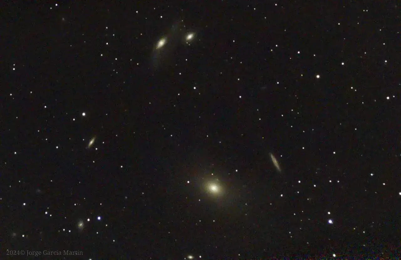 Volvemos a poner a prueba el limite de deteccion de mi instrumental. Se trata de un cumulo de galaxias de magnitud 22 analogo al.que os traje ayer y tambien en las proximidades de la conocida M82 que se asoma en la imagen. El cumulo catalogado como SDSS J095324.38 +693648.7 y del que no hay apenas informacion, se encuentra aun mas lejos que el de ayer, a 3.000 millones de años luz por lo que cuando salio la luz de estos distantes mundos la tierra acababa de formarse. Esta imagen ha sido capturada con un Astrophysics 130EDT desde Cerceda.