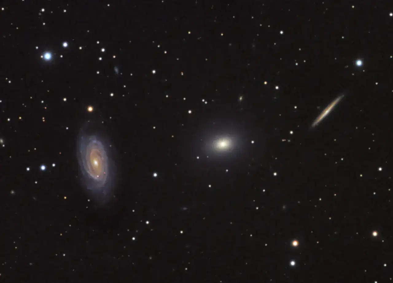 Volvemos a las galaxias y lo hacemos con el notable trio de Draco, un bello conjunto confomado por dos espirales y una eliptica. Esta imagen fue capturada con un telescopio Astrophysics 130EDT desde Cerceda