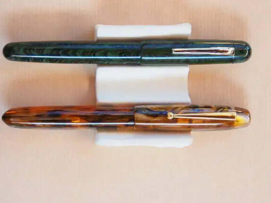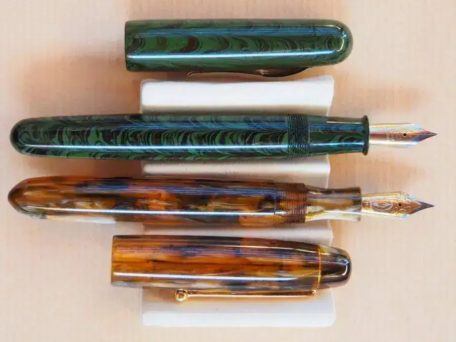 Os presento aquí una de mis recientes adquisiciones, acompañada de otra que hice hace aproximadamente un año. Se trata de una pluma india, la Ranga Duofold large ebonite ripple, en este caso en color verde. Es una pluma del tipo “eyedropper”. Mide 15 cm cerrada y se puede escribir perfectamente con ella sin ponerle el capuchón. Viene montada con un plumín normalito de punto F, de esos que vienen con la inscripción “iridium point”, aunque en el estuche de la pluma viene incluido un juego de repuesto de alimentador y plumín. En el plumín de repuesto está graba la inscripción “Vality. Tipped Fine”. El plumín rascaba a rabiar y escribía con un trazo excesivamente fino para mi gusto, así que le hice un pequeño tratamiento hasta suavizarlo y ensancharle ligeramente el punto de grosor. Ahora escribe con mucha suavidad y sin fallos. No está nada mal por 35 $