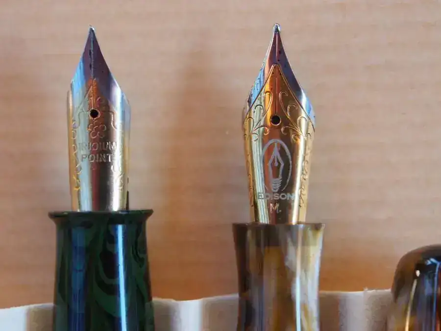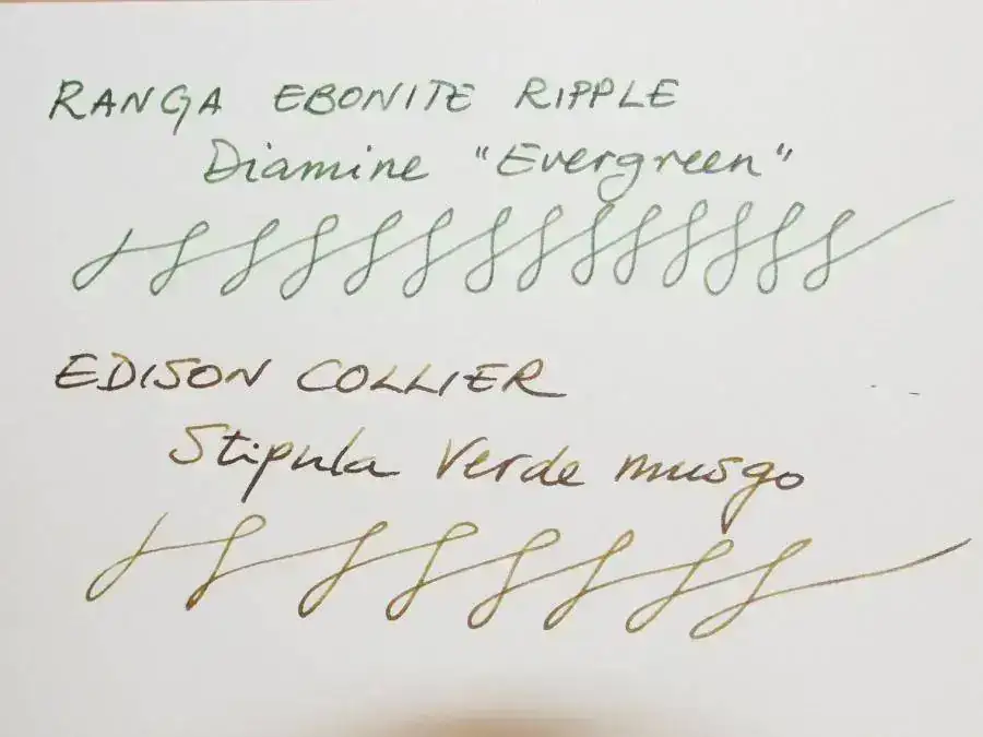 Junto a ella está la yanqui, una Edison Collier, muy parecida en tamaño y diseño. Se la compré a Goulet Pens. Debido a su diseño, no se le puede poner el capuchón al escribir, pero no hace falta, pues tiene porte suficiente y está bien equilibrada. El plumín es de acero (también se podía encargar con plumín de oro, pero se me salía del presupuesto). Lleva grabado, como se aprecia en la foto, en logotipo de la marca y la M que especifica su grosor, un M bastante jugoso, aunque en la muestra de escritura no se aprecie muy bien. La he hecho sobre un papel Galgo Parchemin de 100 g, que, en mi opinión, tiende a afinar el grueso del trazo. He de decir que la Edison Collier ha sido, desde el momento en que la compré, una las plumas del “equipo titular” y no la hago entrar en las rotaciones. La Edison se ve mejor construida y terminada que la Ranga (para eso me costó el triple) y escribir con ella es un placer. Ignoro cómo serán los plumines de oro que montan, pero este de acero, sin ser gran cosa, tiene un desempeño más que notable.
