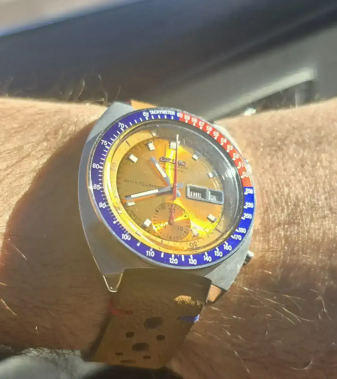 Cuando ya creía que no volvería a tener uno estuve averiguando cosas del Pogue... y la verdad es que me encantó, el calibre 6139B es una pasada, tiene bisel interno giratorio con la corona, pulsando la corona puedes cambiar el día y el día de la semana, es uno de los primeros cronos automáticos de la historia... en fin, me puse a buscar uno en muy buen estado, lo que no es nada fácil y le hice una correa a mano porque los brazaletes de Seiko huecos no son para mí... lo siento, y aquí estoy con él tan contento, me falta pillar una hebilla de Seiko para la correa y a disfrutarlo.