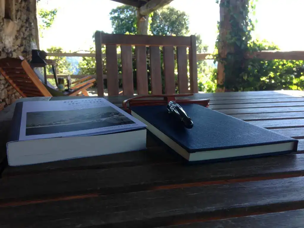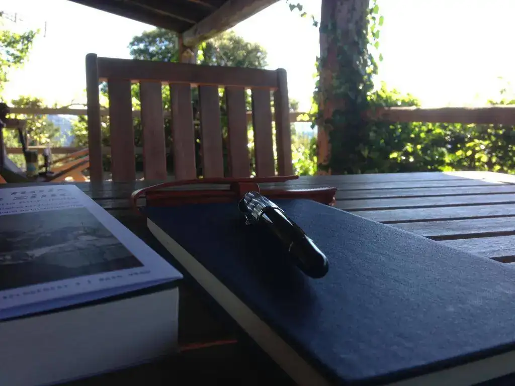 Coincido con los compañeros, y ceo que sé lo que buscaba Roger con la foto.Ok, ok! Lo capto. A ver, la pluma ya es demasiado conocida como para sacarle un buen primer plano..., el libro es Els nois de zinc (Los muchachos de zinc), de la premio Nobel Svetlana Alexiévich, y el cuaderno lo encargué en PaperForFountainPens y tiene papel Tomoe River. Finalmente, el rincón: una casa de turismo rural en el deshabitado departamento francés de la Lozère.