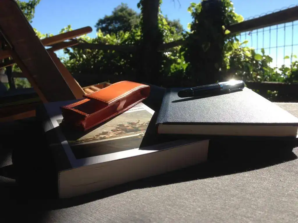 La Aurora 88 es una imponente estilográfica, pero lo mejor de la foto está en lo que se adivina tras el respaldo de la silla frente a la pluma: sosiego, tranquilidad, reposo.