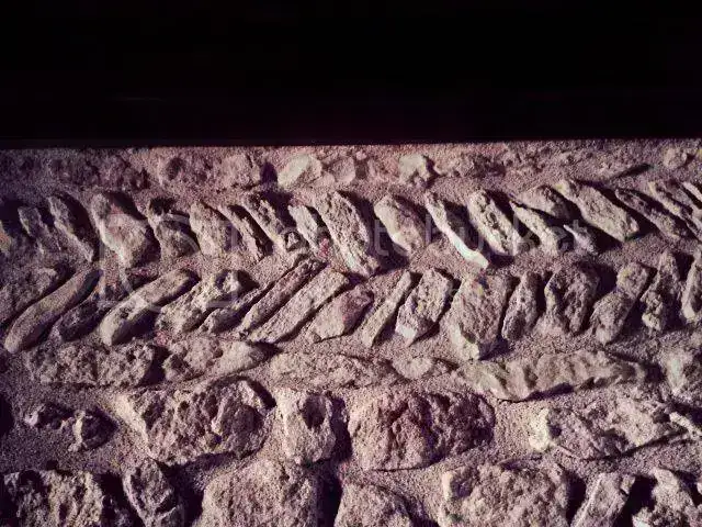 Opus Spicatum u obra en espiga.. tradicional y estética forma de colocar la piedra procedente del horno comunal del siglo XIII, el tercero más antiguo de Europa, y que se ha restaurado por completo..