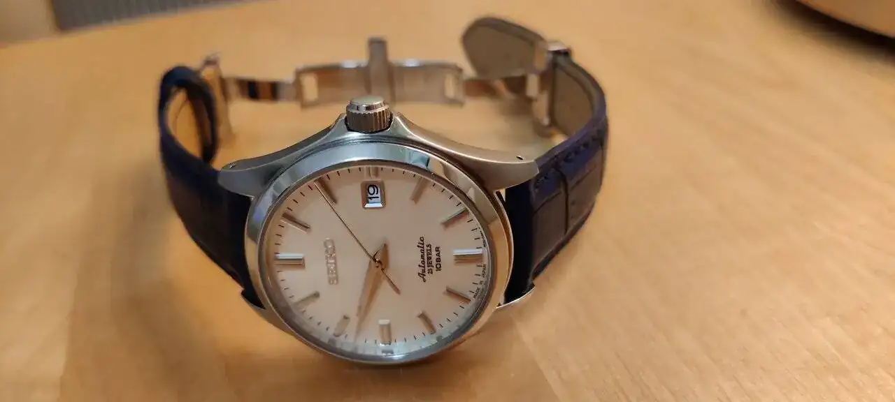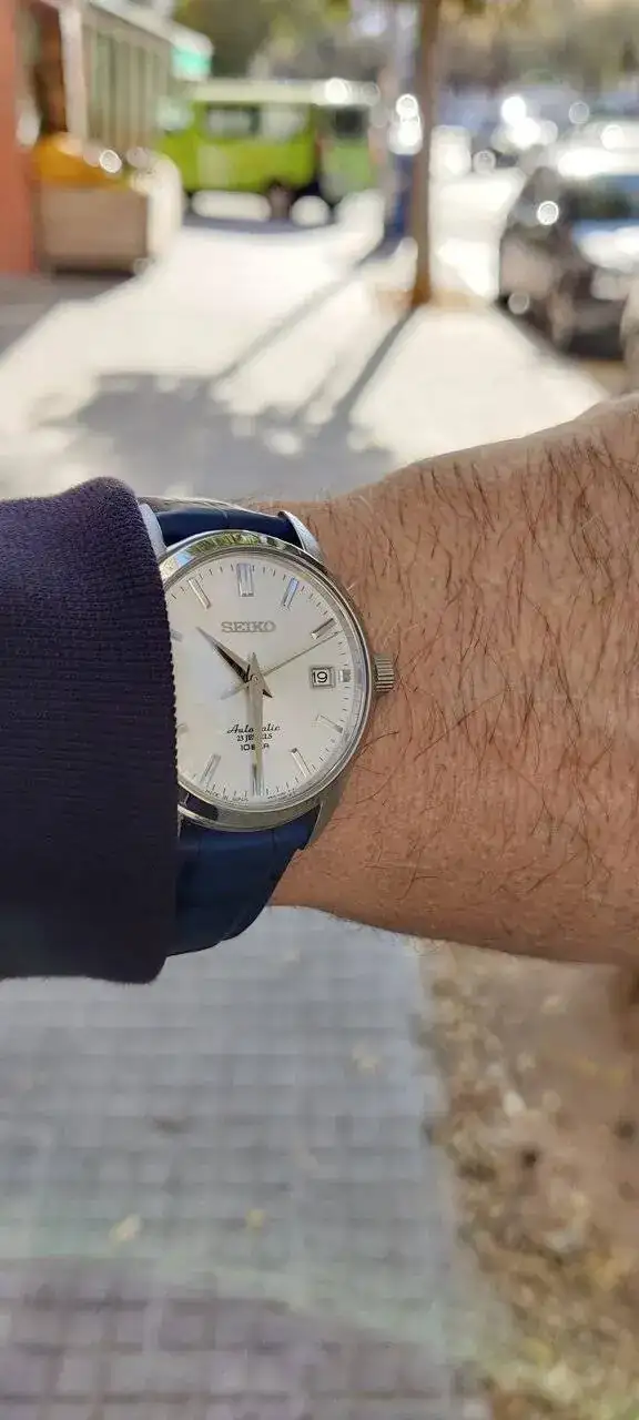 Es un Seiko SZSB011, automático, con caja de 39.9 mm, 12.7 mm. de grosor, 20mm entre asas, y 47mm de extremo a extremo. No tiene cristal de zafiro, una pena, pero como es un reloj sencillo, y como buscaba un Seiko automático no muy caro. Me gusta mucho porque es muy cómodo en mi muñeca de 18 cms. El dial es de color marfil claro, pero también quería una esfera limpia y legible, sobre todo, porque con la edad y la presbicia( que pena) sin gafas, ni torta, pero este se lee muy bien. Como me gustan los Grand Seiko, este tiene un cierto parecido, salvando las distancias, claro. He leído en algún sitio que tiene un apodo, algo así como el hermano pobre de Grand Seiko. El calibre que lleva es el 4R35B, creo, que por lo que he leído, es un calibre sencillo pero robusto. Desde luego está muy bien ajustado, se me adelanta unos 4 o 5 segundos al día, que no se porqué razón técnica mecánica , al dejarlo por la noche, con la corona hacia abajo, se atrasa unos 3 o 4 segundos, y casi que siempre se me mantiene igual, una maravilla. Todo me gusta de este asequible reloj excepto una cosita que es, que los endlinks, creo que lo llaman así, son un poco cortos y no llegan al mismo nivel que el final de las asas, lo cual hace que sobresalga un poco el vértice de las asas. No sé porqué está así. No sé si es para las muñecas más delgadas, pero creo que aún quedaría peor. Si algún forero lo sabe, gracias. Bueno, no me lío más y voy a poner fotos. Otro día pondré otro. Gracias a tod@s.