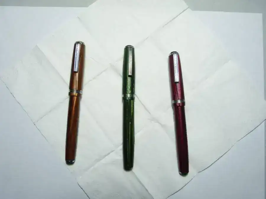 La primera de color marrón tenia el clip separado y el botón que lo unía con el capuchón roto, no he encontrado otra forma de repararlo que pegándolo y han quedado razonablemente bien. Los clip y los plateados los he frotado con paños de tela y palillos de madera hasta mejorarlos.