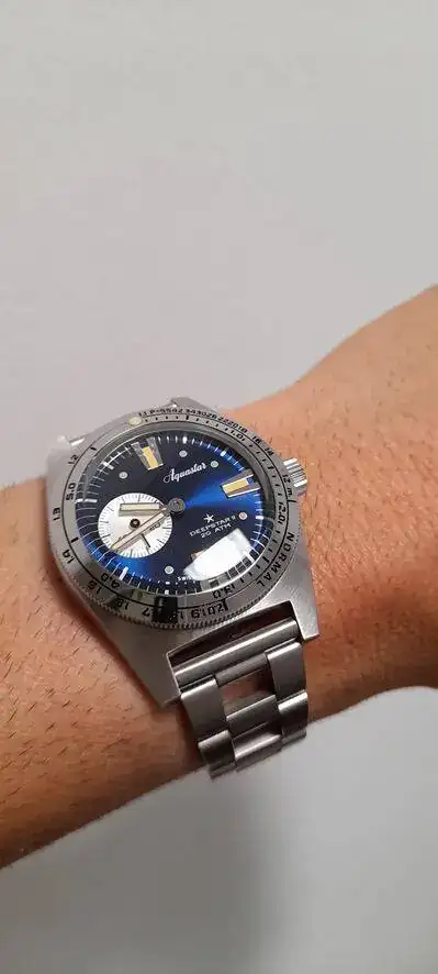 Este Deepstar 2 lleva cristal abombado de zafiro, bisel bi-direccional con escala de descompresión de buceo (aunque ya no se recomienda guiarse por él), WR de 200m y calibre Sellita en fondo ciego. En este video de Youtube puede verse el uso de este bisel en los Aquastar.