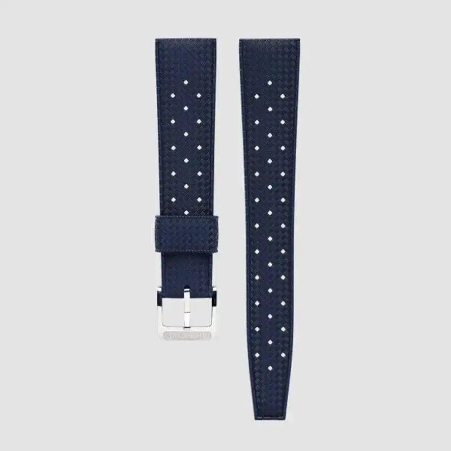 He de admitir, también que según se iba acercando la fecha de la entrega prevista, pensé que una correa azul tipo Tropic no estaría mal en el set final de complementos. Tras barajar varias opciones, me decidí por una MERAUD al tener una longitud contenida opcional (112 x 73mm) en 20/16mm. Quise, además, comprobar si esos 20mm encajarían bien en los 19mm de ancho de asas del Deepstar II. Lamentablemente, por un pequeño retraso, en el momento que escribo ésto todavía no la he recibido.