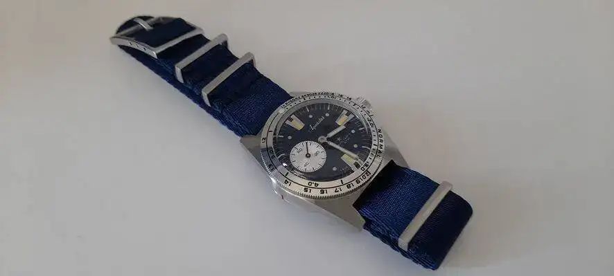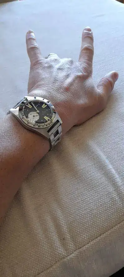 Es entonces cuando miro con detenimiento y satisfacción la esfera azul intensa de un bonito Diver mid-size con small seconds a las 9h, ausencia de datario, caja cepillada y bisel pulido. Me enamora a primera vista.