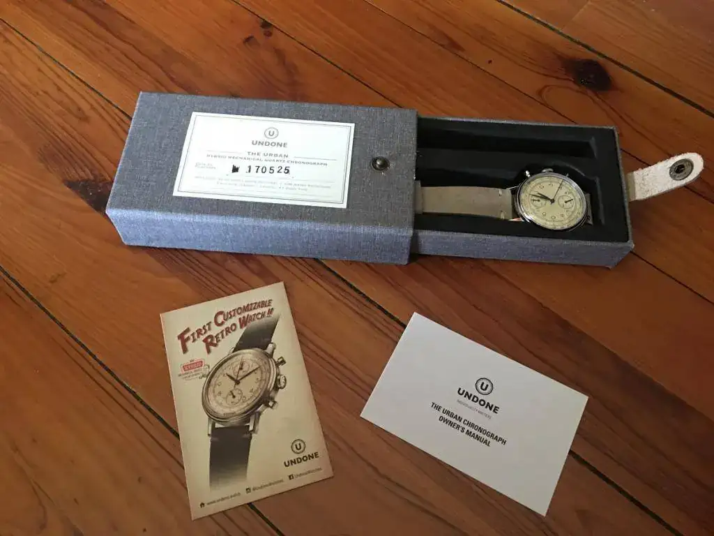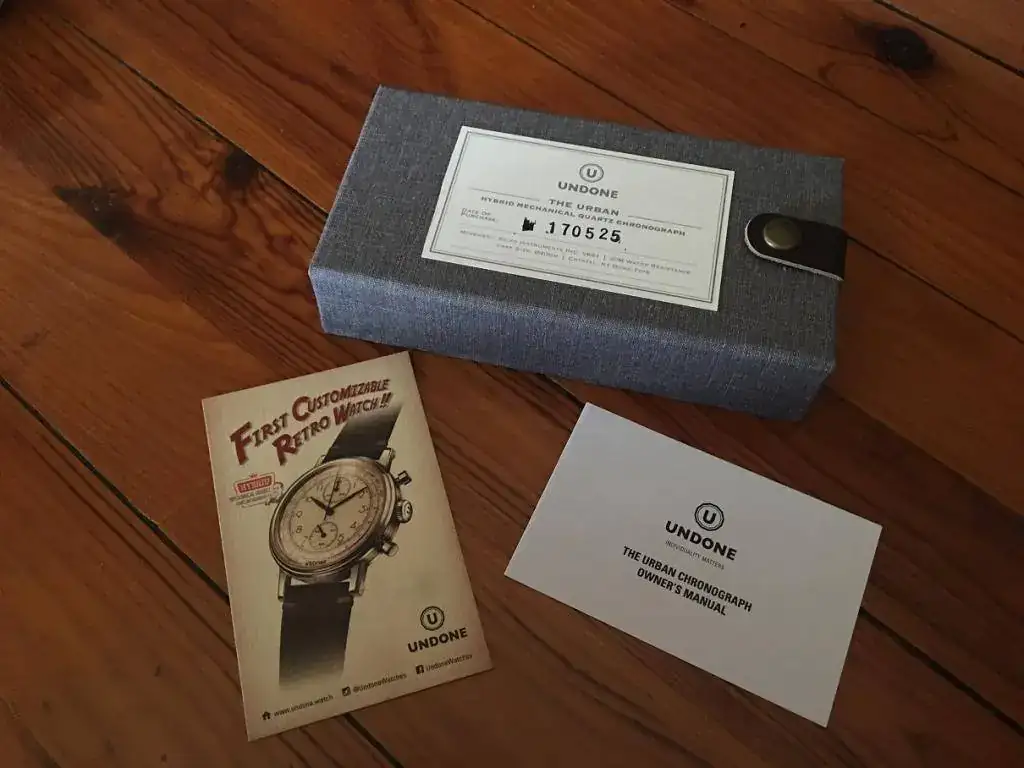 Parece que tenemos estampada la fecha de fabricación del reloj en la caja, a modo de número de serie. También incluye un par de panfletitos con toque vintage. El tacto de la caja es rugoso, realmente curioso con un cierre de cuero con un remache. Me gusta, le da emoción al tema.
