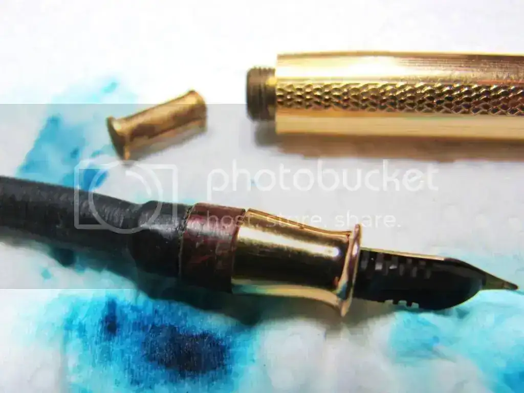 El desmontaje no es complicado puesto que la boquilla va a presión y como cabía esperar el saco de caucho estaba petrificado por el paso del tiempo, me sorprendió ver que la base metálica de la boquilla está fabricada con ebonita Red Ripple.