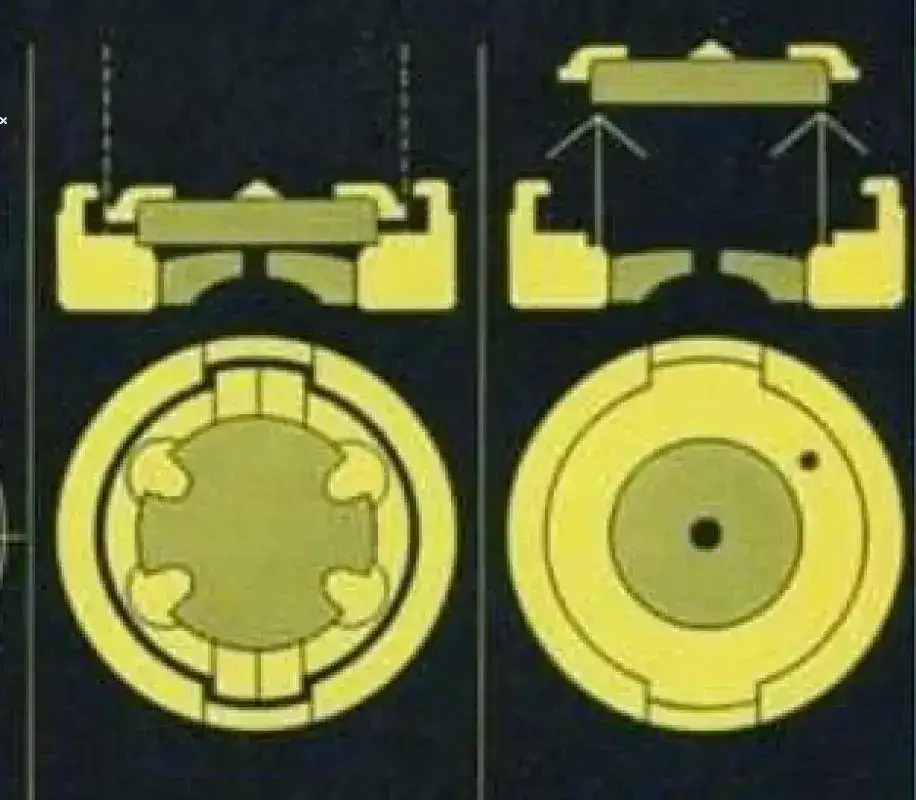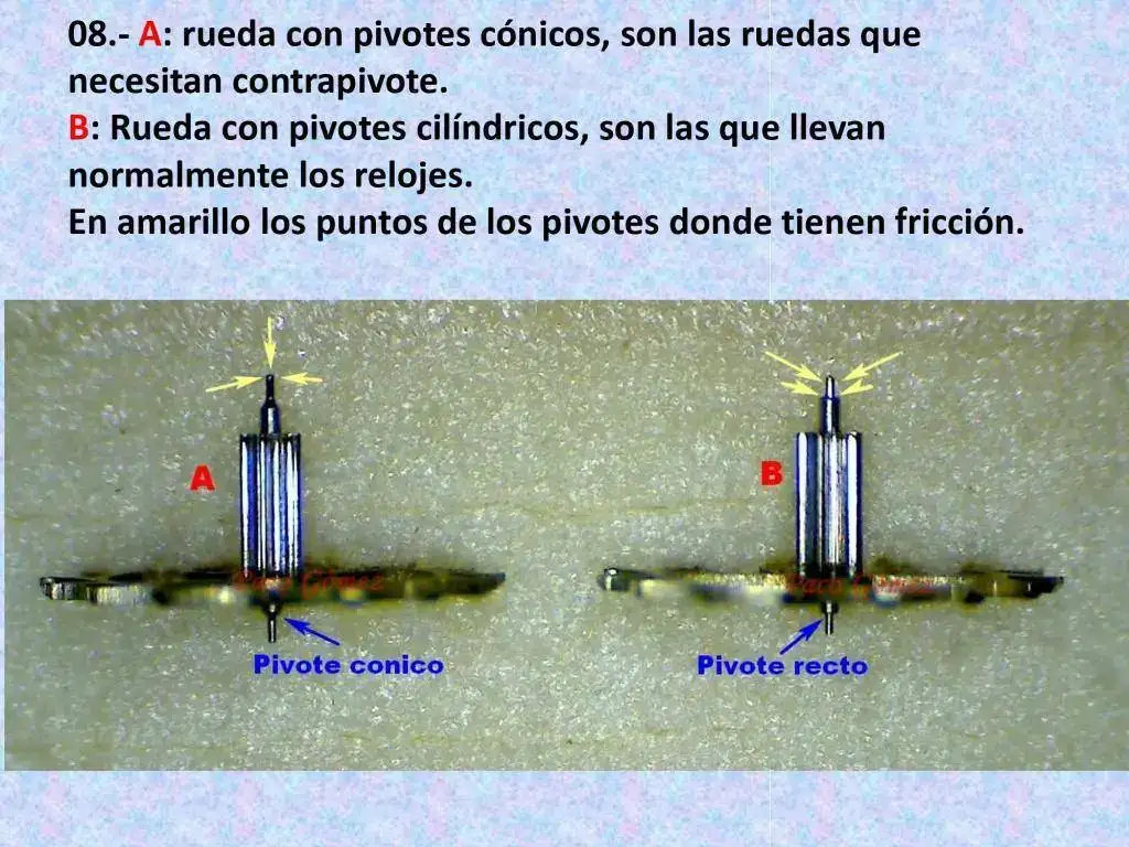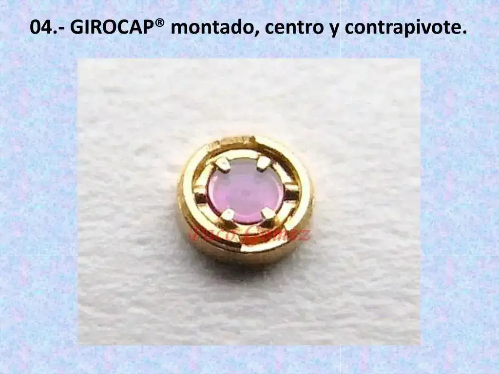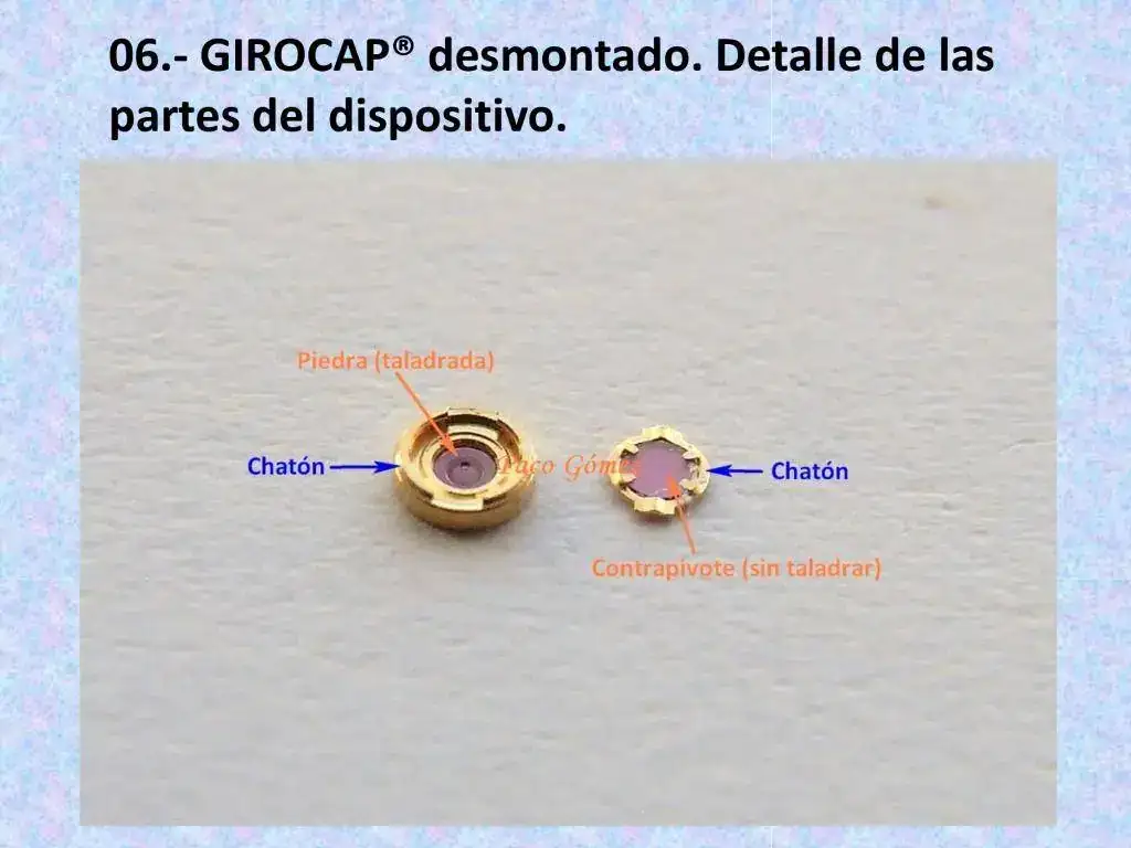 El GIROCAP® es un chatón (1) combinado, esto es, un centro con un contrapivote, todo en un bloque (foto 4) donde asientan los pivotes de la rueda de escape. Los pivotes de esta rueda deben de ser cónicos (foto 7 rueda A), a diferencia de los pivotes cilíndricos (foto 7 rueda B) que son para un centro normal, sin contrapivote.
