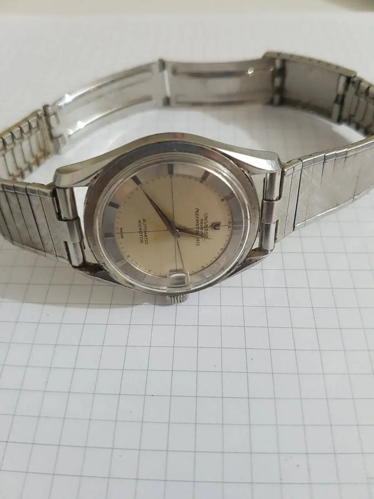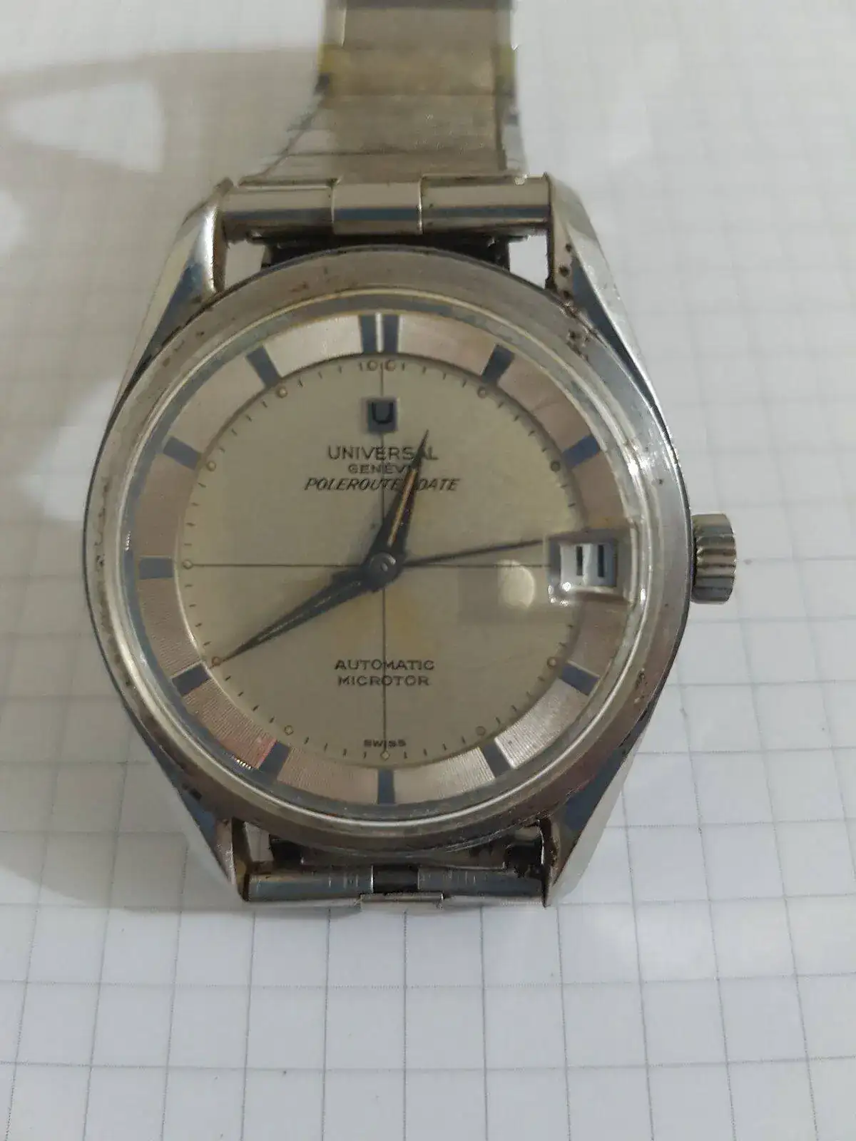 Pues otra de las piezas conservadas por mi abuelo es un Universal Geneve Polerouter Date. Por lo que he podido buscar por internet, creo que se trataría de la referencia 204503-3 que llevaría dentro del calibre 215 con microrotor. Si gracias a las imágenes alguien puede aportar más información sobre la el reloj, será bienvenida.
