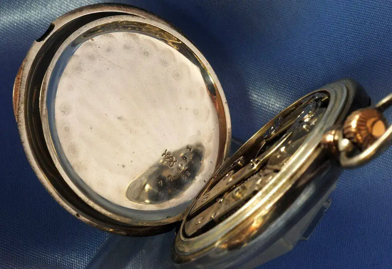 Pero lo que es realmente especial y muy poco visto es la caja (original del reloj). Realizada por uno de los mejores fabricantes de cajas americano de la época "Jeannot & Shiebler" que se encargaba de realizar las cajas apropiadas para estos relojes de importación, está realizada en plata oxidada con incrustaciones de oro puro como pueden ser la corona, el cuello, las bisagras y las pestañas para abrir la tapa. os puedo asegurar que se ven muy pocas así y posiblemente debió tratarse de un encargo especial.