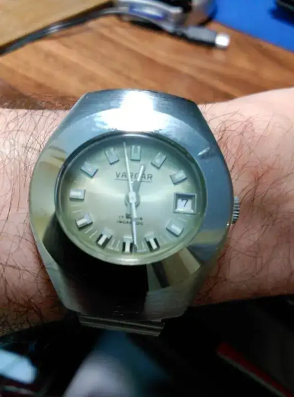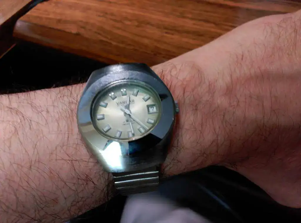 El reloj es de los años setenta. Montan un calibre suizo Ronda 1235-21. Tiene una estética muy futurista absolutamente propia de la época y no hay duda de que es totalmente de estreno.