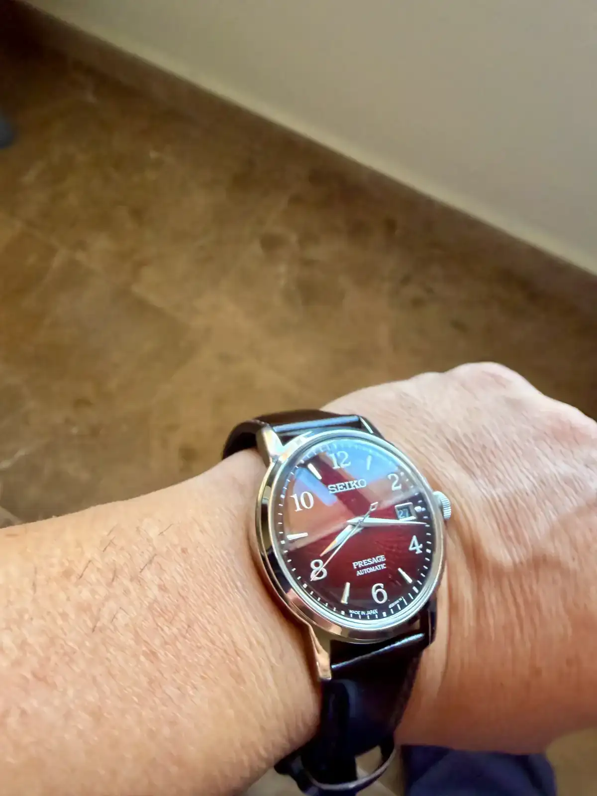 Enhorabuena, es un color muy atractivo, lo veo muy bonito, me gusta ese "burdeos".Una mala foto rápida, la verdad que viene muy bien presentando con una gran caja y dos correas.