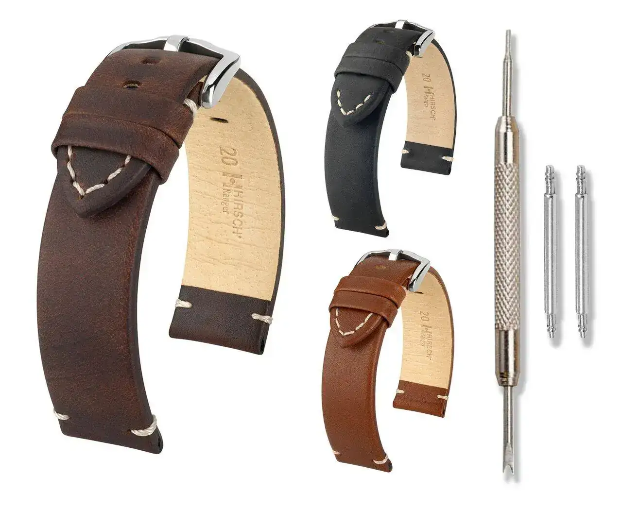Con respecto a la correa, mi voto por una de lagarto ... que le da un toco añejo como le corresponde (te enlazo con un distribuidor español). El color a tu gusto y según quieras combinar: